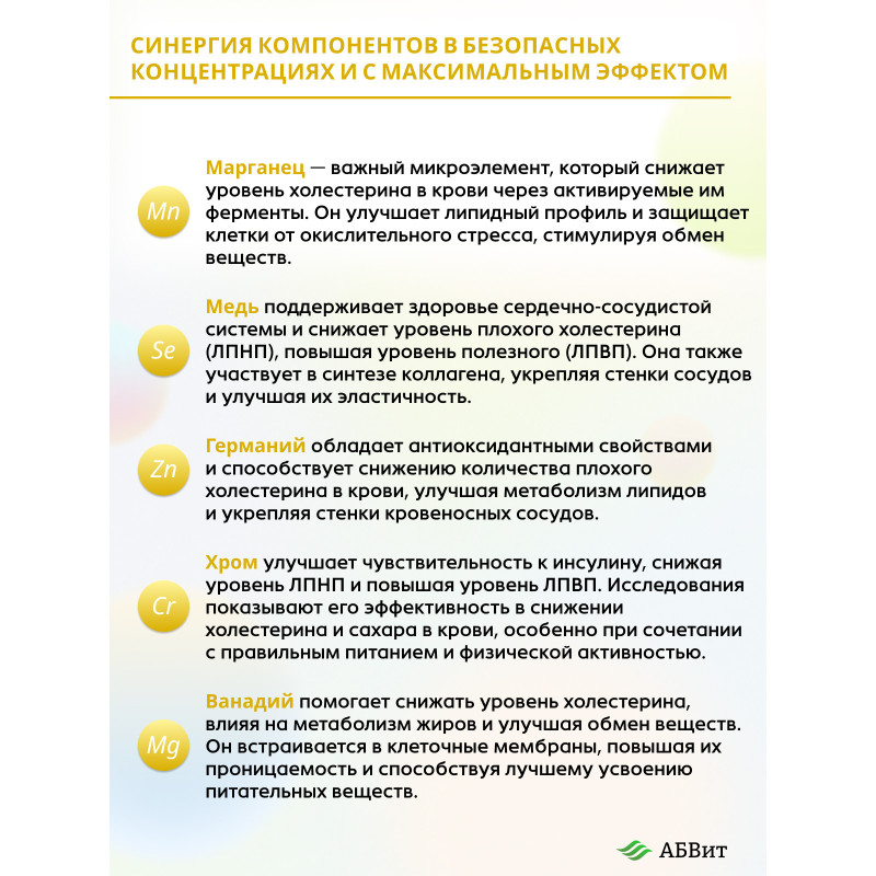 Минеральный комплекс Анти-Холестерин от АБВит отлично усваиваются организмом и не содержат искусственных добавок, что делает их безопасными для ежедневного употребления.