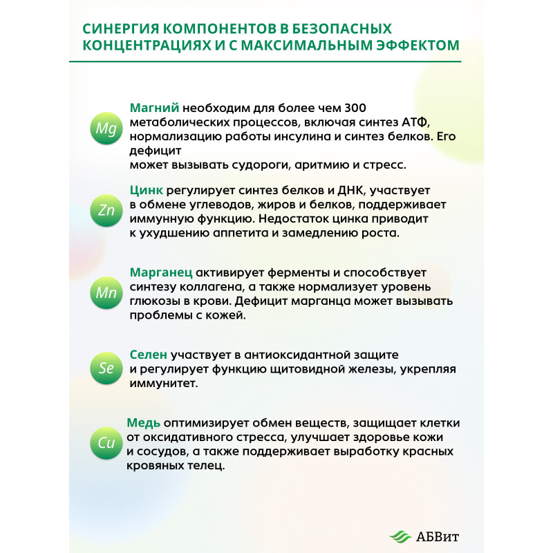 Кроме того, минеральный комплекс Метаболизм от АБВит оказывает положительное влияние на состояние кожи, делая ее более упругой и здоровой. Уникальная формула продукта включает микроэлементы, которые способствуют детоксикации организма, очищая его от токсинов и шлаков. Это, в свою очередь, поддерживает не только здоровье кожи, но и общее самочувствие.