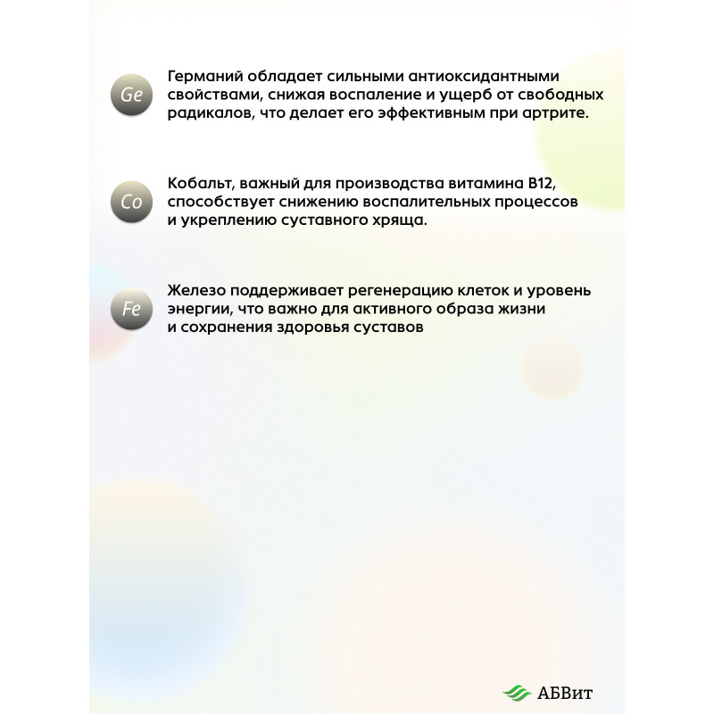 В состав минерального витаминного комплекса Стоп Артрит от АБВит входят: магний, цинк, марганец, селен, медь, германий, кобальт, железо, серебро. Этот продукт рекомендуется к использованию как в рамках комплексной терапии, так и в качестве профилактического средства. Особенно комплекс полезен для людей пожилого возраста, профессиональных спортсменов и тех, кто ведет активный образ жизни, подвергая свои суставы дополнительной нагрузке!