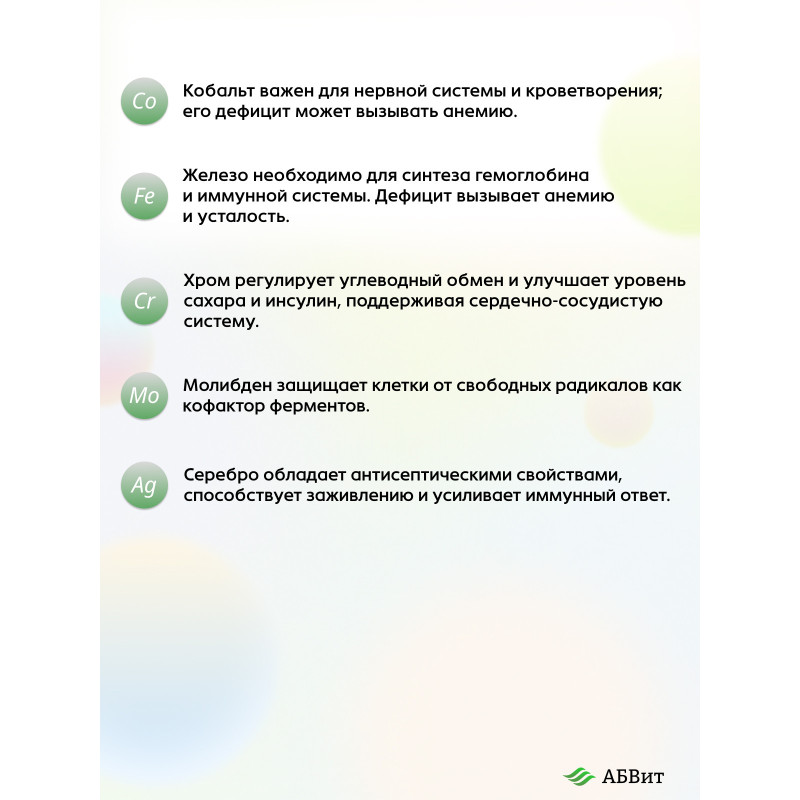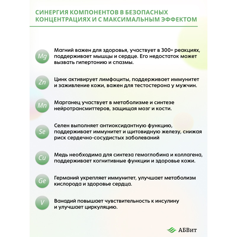 Формула минерального комплекса содержит хелатированные микроэлементы, такие как магний, цинк и медь, которые способствуют не только укреплению иммунной системы, но и улучшению общего состояния организма. Микроэлементы от АБВит играют ключевую роль в поддержании здоровья, особенно в условиях повышенного стресса, когда потребность в питательных веществах возрастает.