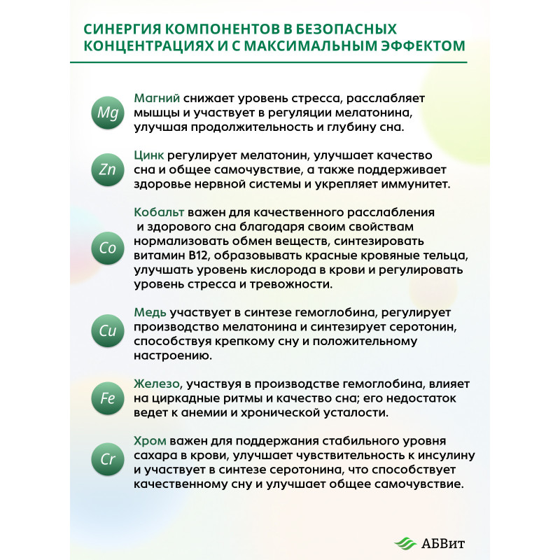 Минеральный комплекс Здоровый Сон от АБВит, который станет надежным помощником в борьбе с бессонницей и стрессом! Этот продукт разработан специально для тех, кто стремится улучшить качество своего сна и создать оптимальные условия для полноценного ночного отдыха. Благодаря уникальной формуле, он помогает справиться с тревогой и расслабиться, способствуя крепкому сну.