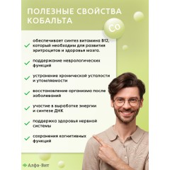 Кобальт от АЛФА-ВИТ играет важную роль в процессе формирования клеток крови, что особенно актуально для профилактики анемии. Он также участвует в синтезе витамина В12, который необходим для нормального функционирования нервной системы и поддержания умственной активности. Благодаря биодоступной форме, витамины быстро усваиваются организмом, обеспечивая максимальную эффективность.