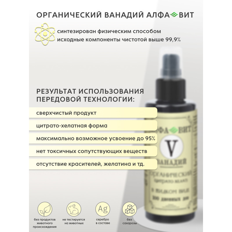 Ванадий хелат органический от АЛФА-ВИТ - это эффективная пищевая добавка, предназначенная для поддержки здоровья и улучшения общего самочувствия. Этот продукт является мощным антиоксидантом, который помогает защищать клетки от свободных радикалов, способствуя омоложению организма и поддержанию иммунитета.