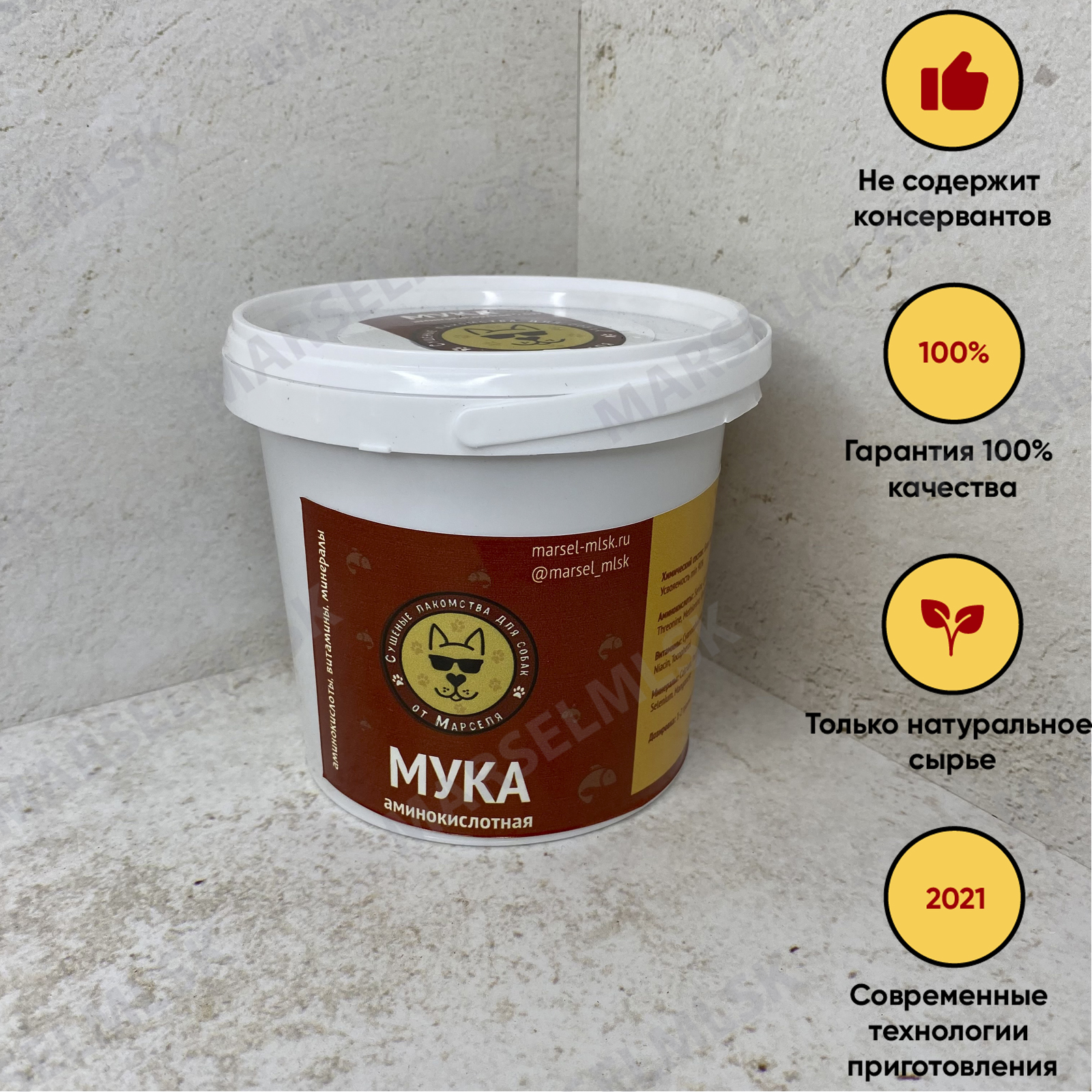 Чем полезна аминокислотная мука? Увеличивает выносливость организма; Позволяет набирать мышечную массу; Укрепляет суставы и связки; Улучшает аппетит; Является природным источником хондроитина; Аминокислотная мука это (высокопротеиновая добавка) поможет спортивным собакам поддерживать уровень белка в организме. Белок необходим для построения тканей всех органов, мышц, костей и тела в целом. Высокоусваеваемая рыбная добавка, содержащая в себе природный комплекс витаминов , также ОЧЕНЬ богата аминокислотами. Представляет собой порошок, добавляется в ежедневный рацион питомца исходя из 1-2 г / на кг веса в сутки и замечательно сочетается с маслами и прекрасно дополняет рацион питомца. Серьезно увеличивает выносливость, за счет высокого содержания протеина позволяет набрать мышечную массу, укрепляет суставы и связки, улучшает аппетит! Добиться такого эффекта получилось за счет смешения 3ех видов морских и океанических обитателей, высушенных по уникальной технологии с сохранением всех витаминов и минералов Усвояемость данной добавки в организме свыше 90% В состав входят аминокислоты: Serine, Cystine, Proline, Tyrosine, Histidine, Phenylalanine, Threonine, Methionine, Glutamic acid А также содержит природный источник хондроитина. Дозировка: 1 г на 1 кг веса питомца, но не более 30 грамм в сутки. Для кого подходит: Подходит абсолютно любой породе с 4-х месяцев.