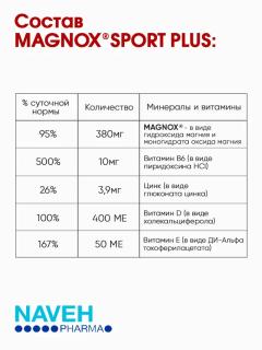 Специально разработанный спортивный витаминно минеральный комплекс Magnox Sport (Магнокс Спорт) от израильской фармацевтической компании Naveh Pharma для повышения выносливости и улучшения работоспособности организма.