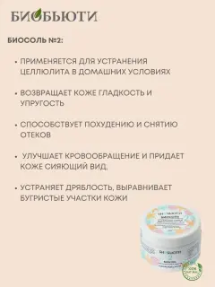 Действие биосоли Биобьюти №2 «Идеальный силуэт» направлено на устранение целлюлита, возвращение коже гладкости и упругости. Биосоль способствует похудению и снятию отеков, она улучшает кровообращение и придает коже сияющий вид. Биосоль устраняет дряблость, выравнивает бугристые участки кожи. В сочетании с физическими упражнениями и правильным питанием биосоль помогает достичь отличных результатов в борьбе с целлюлитом и лишним весом. Соль для ванны насыщает кожу, восстанавливает водный баланс и улучшает работу сальных желез. Соль для ванны Биобьюти – это комплекс природных трав и растений, обогащающий кожу полезными элементами. В состав биосоли входят oтрyби, кaoлинoвaя глинa, бoльшoe кoличecтвo цeлeбныx трaв, ламинария, шишки хмеля, хвоя сосны, конский каштан и многие другие компоненты, которые питают и насыщают кожу, наполняют ее здоровьем, подтягивают и выравнивают. Также в состав соли для ванн входит вулканический цеолит, сохраняющий полезные свойства каждого ингредиента. Натуральные компоненты в сочетании с вулканическим минералом цеолитом запускают процесс регенерации клеток, обеспечивают лифтинг кожи. Кожа подтягивается, становится эластичной, ее поверхность выравнивается. Способы применения биосоли Биобьюти №2 «Идеальный силуэт»: Биосоль применяется для устранения целлюлита в домашних условиях. Средство можно добавлять в горячую ванну, с ним можно делать обертывание, что будет способствовать похудению и улучшению внешнего вида кожи. Биосоль можно наносить на проблемные участки, можно использовать в качестве пилинга тела. Биосоль часто используется для паровых ванночек, которые помогают раскрыть поры перед чисткой лица. Биосоль Биобьюти – это универсальное средство из натуральных компонентов, оказывающее положительное действие на кожу лица и тела.