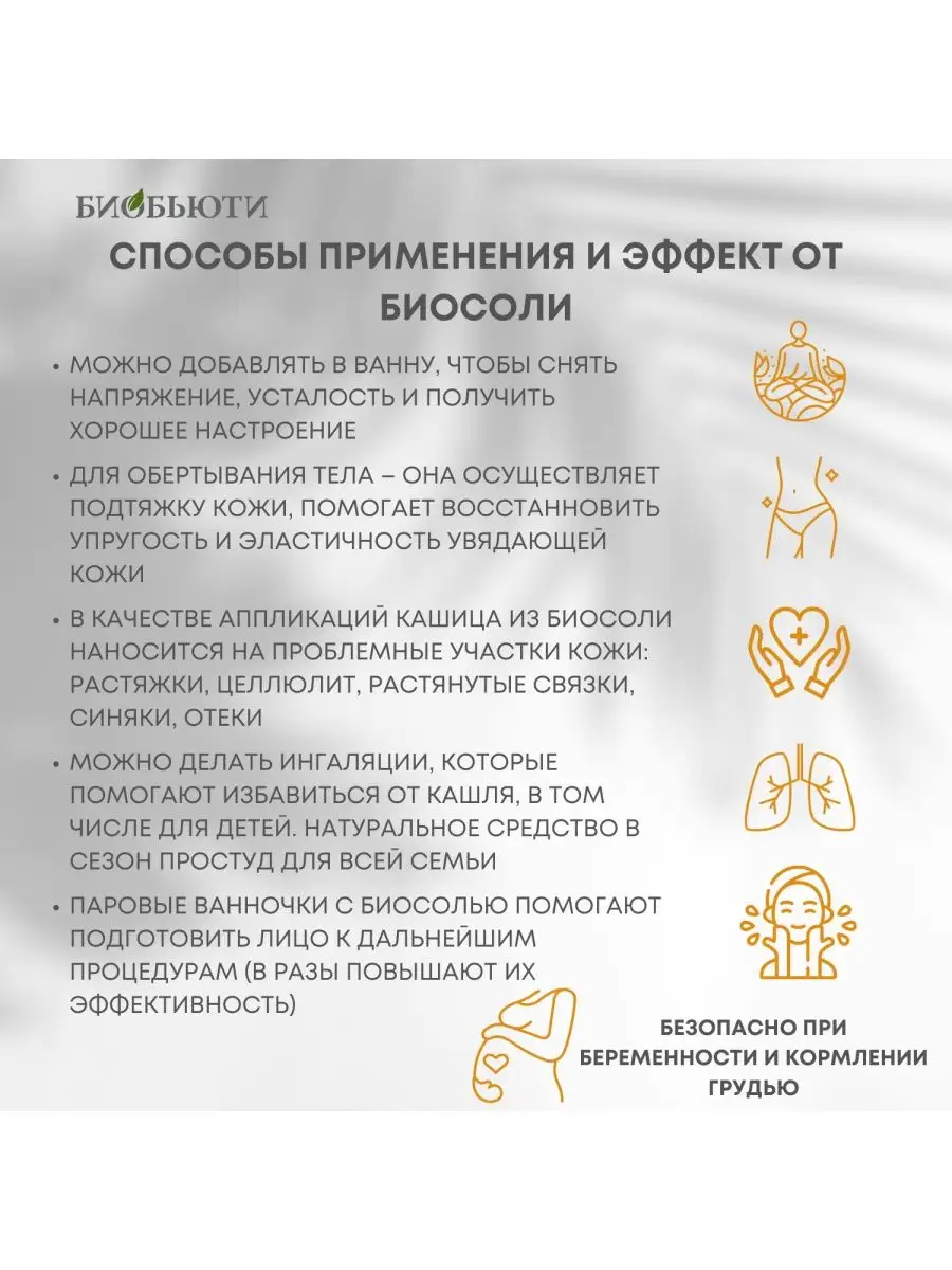 Биосоль Биобьюти №3 – это универсальное средство для различных спа-процедур: расслабляющих горячих ванн, обертываний, паровых ванночек и аппликаций. Лечебная соль является полезным комплексом, используемым в домашних условиях, который делает кожу нежной и эластичной. Биосоль Биобьюти №3 «Нежная кожа» устраняет шелушение и сухость кожи. Биосоль смягчает кожу, способствует регенерации клеток, обладает подтягивающим эффектом. Средство отлично питает сухую кожу, наполняет ее влагой и всеми необходимыми витаминами. Соль для ванны состоит из природных растений и трав, плодов и корений, минералов и солей, которые обогащают кожу полезными элементами. В состав биосоли входит цеолит – вулканический минерал, обладающий рядом полезных свойств. Цеолит выполняет роль природного консерванта, он сохраняет полезные свойства растений и активирует их действие во время использования соли. Отсутствие химических веществ в составе соли для ванн позволяет использовать ее даже для самой чувствительной кожи. Биосоль оказывает лечебное воздействие на кожу, а также успокаивает нервную систему. Биосоль дарит полноценное увлажнение кожи при любом способе ее использования. Способ применения биосоли: Биосоль Биобьюти добавляют в горячую ванну, принятие которой способствует питанию и насыщению кожи, расслаблению тела и нервной системы. Соль используют для обертывания тела – она осуществляет подтяжку кожи, с ее помощью восстанавливается упругость и эластичность увядающей кожи. Биосоль применяют в качестве грязевых аппликаций – приготовленную смесь наносят на определенный участок кожи и держат некоторое время. С биосолью можно делать ингаляции, которые помогают избавиться от кашля и готовят кожу лица к нанесению масок. Комплексное использование биосоли и маски Биобьюти позволяет сохранить молодость кожи и свежий цвет лица.