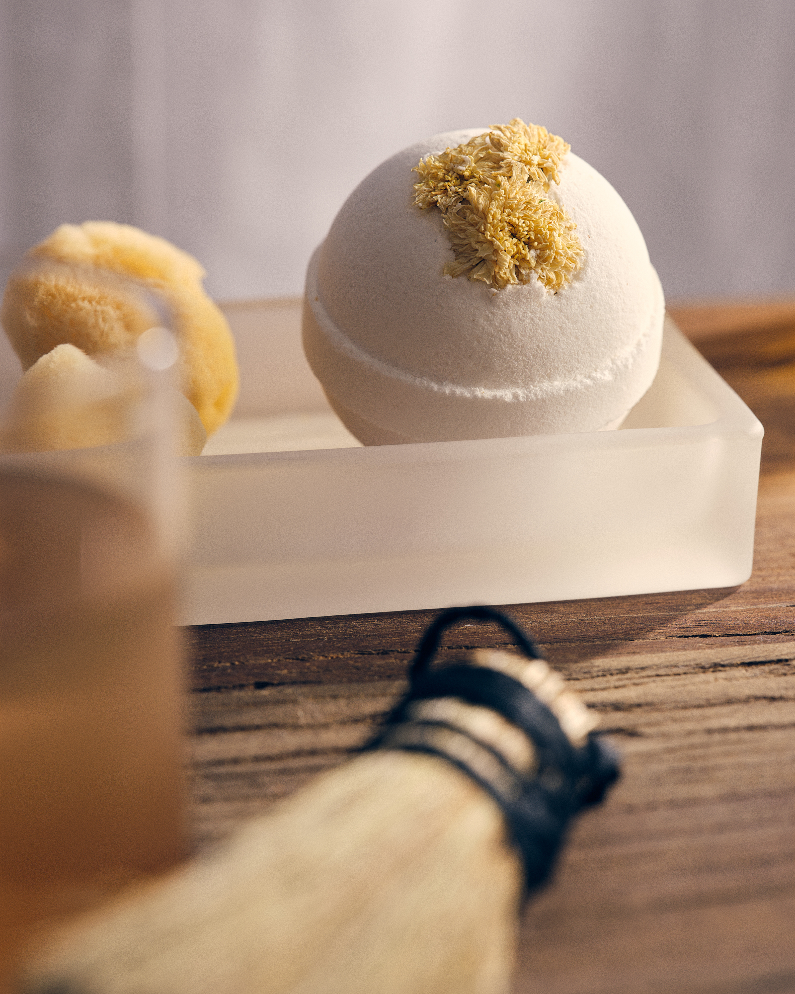 Состав: пищевая сода, лимонная кислота, морская соль, цветы хризантемы, эфирное масло шалфея мускатного, герани, грейпфрута.