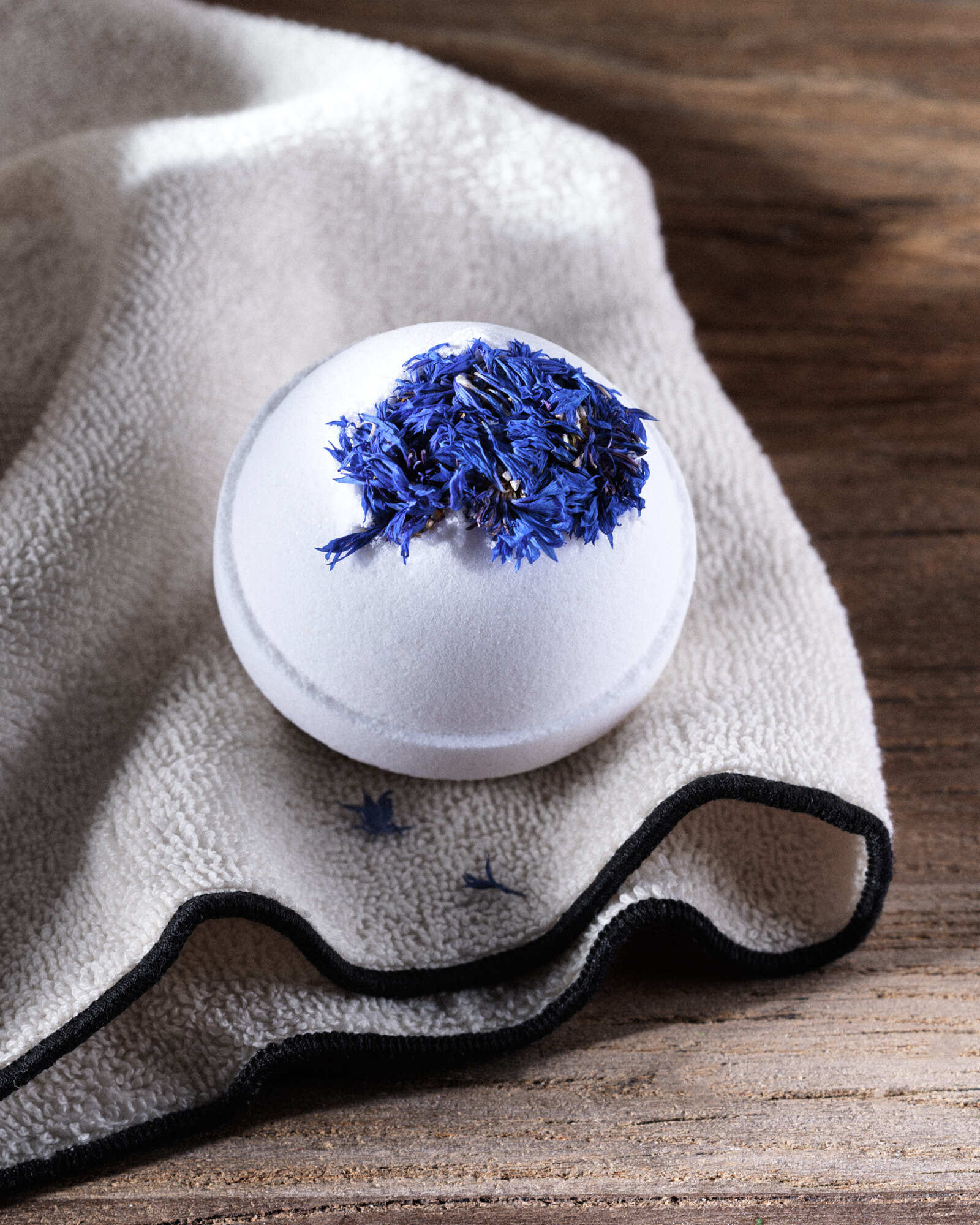 Состав: пищевая сода, лимонная кислота, морская соль, эфирное масло лемонграсса и лаванды, цветы василька.