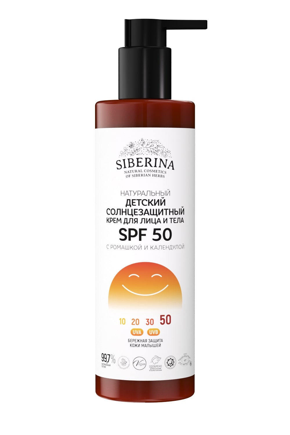 Детский солнцезащитный крем с SPF 50 предназначен специально для нежной и чувствительной кожи малышей. Он содержит только безопасные гипоаллергенные компоненты и обеспечивает максимальную защиту детской кожи от неблагоприятного воздействия УФ-лучей. С таким эффективным и натуральным средством вы можете быть спокойны за своего ребенка, когда он гуляет, играет на свежем воздухе и купается. Благодаря легкой текстуре средство легко распределяется, не вызывая липкости и жирного блеска. В составе нет наночастиц, поэтому при нанесении крем может оставлять на коже легкий белый след. ОКСИД ЦИНКА является эффективным физическим ультрафиолетовым фильтром, создаёт на поверхности кожи невидимый барьер, который отражает UVA/UVВ-лучи. Еще один природный УФ-фильтр - МАСЛО МАЛИНЫ: оно поглощает излучение А и В типа, помогая крему достичь высокой степени защиты от солнца, а также стимулирует выработку меланина. ЭКСТРАКТЫ РОМАШКИ, КАЛЕНДУЛЫ И БИСАБОЛОЛ уменьшают покраснение и раздражение, смягчают и успокаивают чувствительную кожу. ВИТАМИН Е оказывает антиоксидантный эффект и укрепляет барьерную функцию кожи. ОБЪЕМ: 200 ± 5 мл. СРОК ГОДНОСТИ: 18 месяцев, после вскрытия хранить 3 месяца.СОСТАВ: Aqua (вода дистиллированная), Zinc oxide (оксид цинка), Rubus idaeus seed oil (масло малины), Coco-caprylate/caprate (коко-каприлат/капрат), Polyglyceryl-4 Olivate/Polyricinoleate (полиглицерил-4 оливат/полирицинолеат), Coconut oil (масло кокосовое), Glycerin (глицерин), Prunus amygdalus dulcis (Sweet almond) oil (масло миндаля), Magnesium sulfate (сульфат магния), Stearic acid (стеариновая кислота), Benzyl alcohol (бензиловый спирт), Tocopheryl acetate (витамин Е), Xanthan gum (ксантановая камедь), Bisabolol (бисаболол), Panthenol (Д-пантенол), Calendula officinalis flower extract (экстракт календулы), Panax ginseng extract (экстракт женьшеня), Chamomilla recutita (matricaria) flower extract (экстракт ромашки), Ethylhexylglycerin (этилгексилглицерин).СПОСОБ ПРИМЕНЕНИЯ: Перед первым использованием встряхнуть и медленно нажать на дозатор 15-20 раз. Легкими массажными движениями нанести крем на кожу лица за 15-20 минут до выхода на солнце, излишки убрать салфеткой.