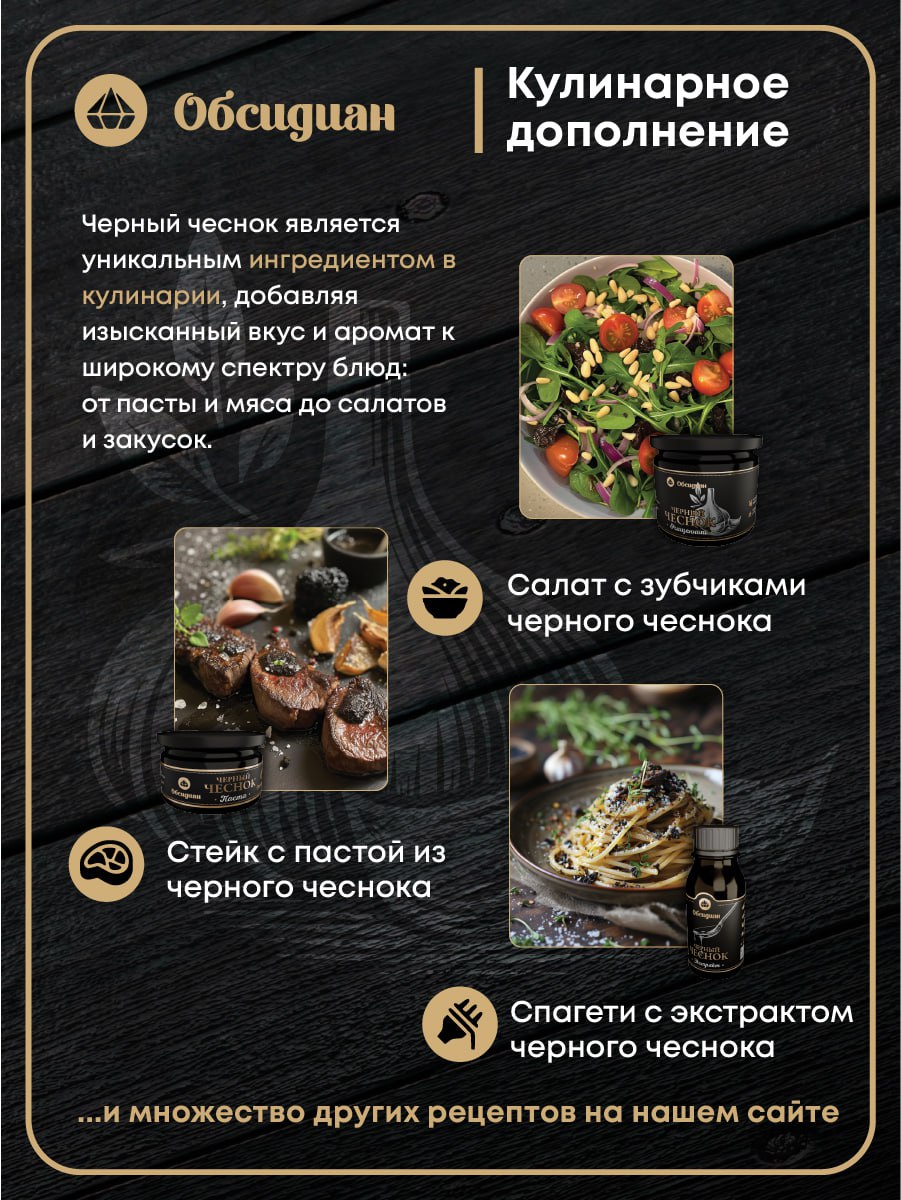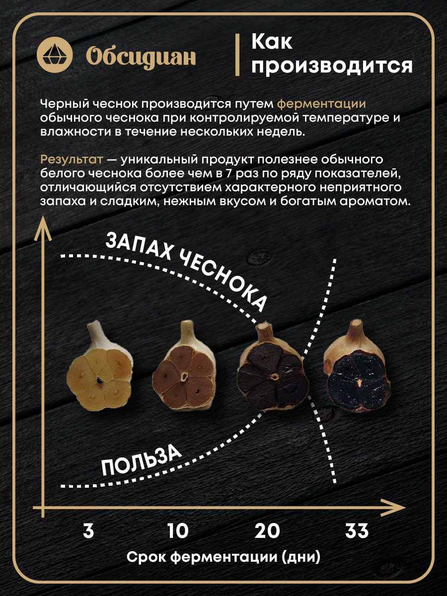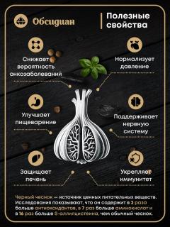 Черный чеснок Обсидиан ценится за свой необычный вкус и многочисленные полезные свойства. Является мощным средством для укрепления иммунитета и защиты от свободных радикалов. Черный чеснок также богат витаминами, минералами и аминокислотами, которые необходимы для поддержания здоровья и хорошего самочувствия.