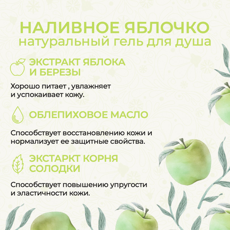 В геле для душа «Наливное яблочко» содержится сила русских сказок, щедрость цветущих русских садов и эффективность инноваций.