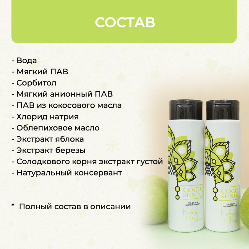 Наша новая линейка COCOSHNIK – мечта фанатов мытья в душе. Особенно мы гордимся гелем для душа «Наливное яблочко». И вы тоже его полюбите! Ведь изумрудно-зелёное «Наливное яблочко» подходит для всех типов кожи. Особенно для тусклой и обезвоженной.