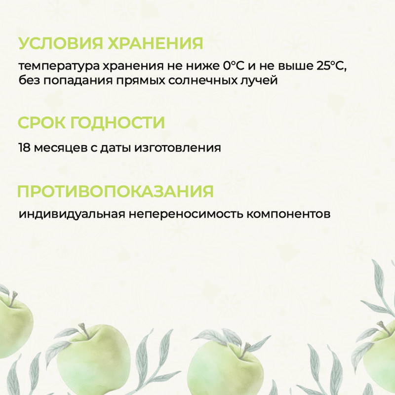 Все компоненты эффективно восстанавливают клетки кожи, делая её здоровой, насыщенной витаминами и сияющей. Натуральный яблочный аромат подарит заряд бодрости и отличного настроения надолго!