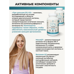 Биологически активная добавка невероятно полезна для женского и мужского организма, отличается уникальным составом. В ней содержится витамин D3, кальция цитрат, фосфат кальция, карбонат кальция, диоксид кремния и витамин К2 в форме менахинона. Препарат поддерживает сердечный ритм в норме, снижает вероятность судорог и нервной возбудимости. Комплекс улучшает состояние кожи, стимулирует рост волос при выпадении, укрепляет кровеносные сосуды, в т.ч. головного мозга. Это комплексное пищевое средство для укрепления иммунитета, внимания и памяти, восстановления организма после физических нагрузок, для выносливости, контроля над весом при похудении без медицинских лекарств и таблеток. Подобранные компоненты комплекса неразрывно связаны между собой: Витамин Д3 отвечает за всасывание кальция кишечником в полном объеме и усиливает степень усваивания этого микроэлемента. Витамин K2 активирует специальный белок (остеокальцин), отвечающий за накопление кальция в костной ткани и зубах. Кроме того, витамин транспортирует кальций в те участки тела, где элемент особенно необходим. Также Витамин К2 улучшает всасывание и усваивание Витамина Д3. В итоге элементы пищевой добавки работают «в тандеме», усиливая действие друг друга. Рекомендуем принимать по 2 жевательные таблетки 2 раза в день во врем еды. Таблетки имеют натуральный аромат клубники.