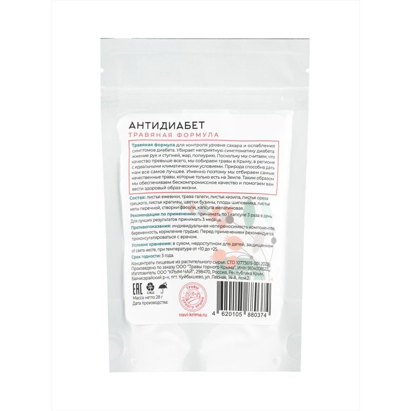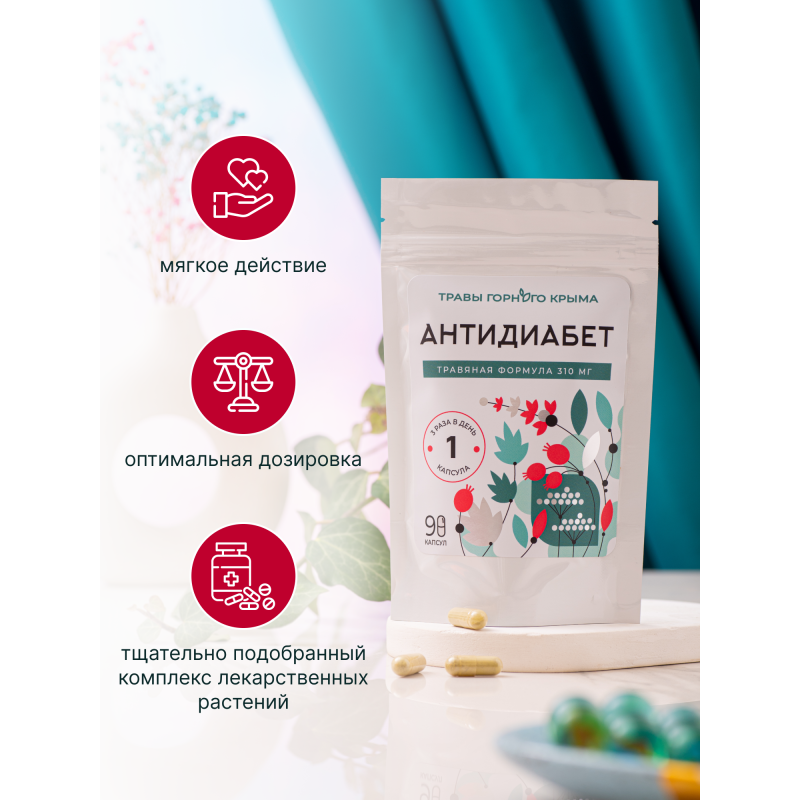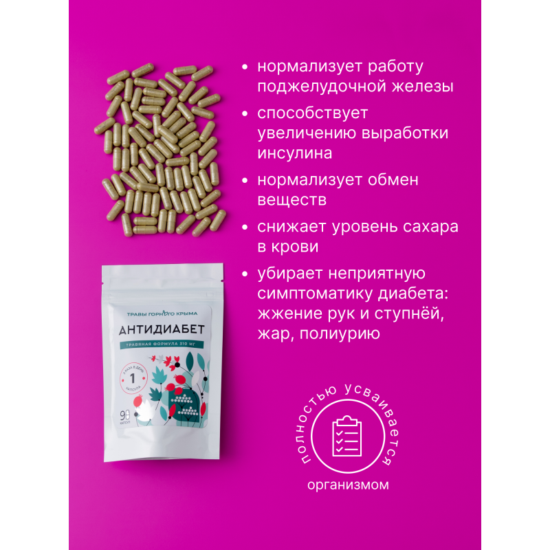 Противодиабетические капсулы– это готовый комплекс из сушеных трав, средство, специально разработанное для женщин и мужчин, страдающих от диабета. БАД способствует снятию воспалительного процесса в поджелудочной железе и увеличению выработки инсулина, нормализует обмен веществ. Состоит из полезных крымских листьев и цветов, известными своими целебными свойствами. Употребление травяной формулы поможет поддерживать здоровое состояние организма. Препарат снижает уровень сахара в крови, помогает контролировать глюкозу, а также стимулирует общее оздоровление. Компоненты и экстракты также обладают кровоочистительным, мочегонным и стимулирующим нервную систему действием, при котором оказывается стимулирующее влияние на поджелудочную железу, в результате чего увеличивается выработка собственного инсулина. Комплексная формула обладает накопительным эффектом, курс приема рассчитан на 3 месяца. В отличие от быстродействующих лекарств, травяные таблетки действуют мягко, не вызывая дискомфорта и побочных действий. Подходят вегетарианцам и приверженцам правильного питания.