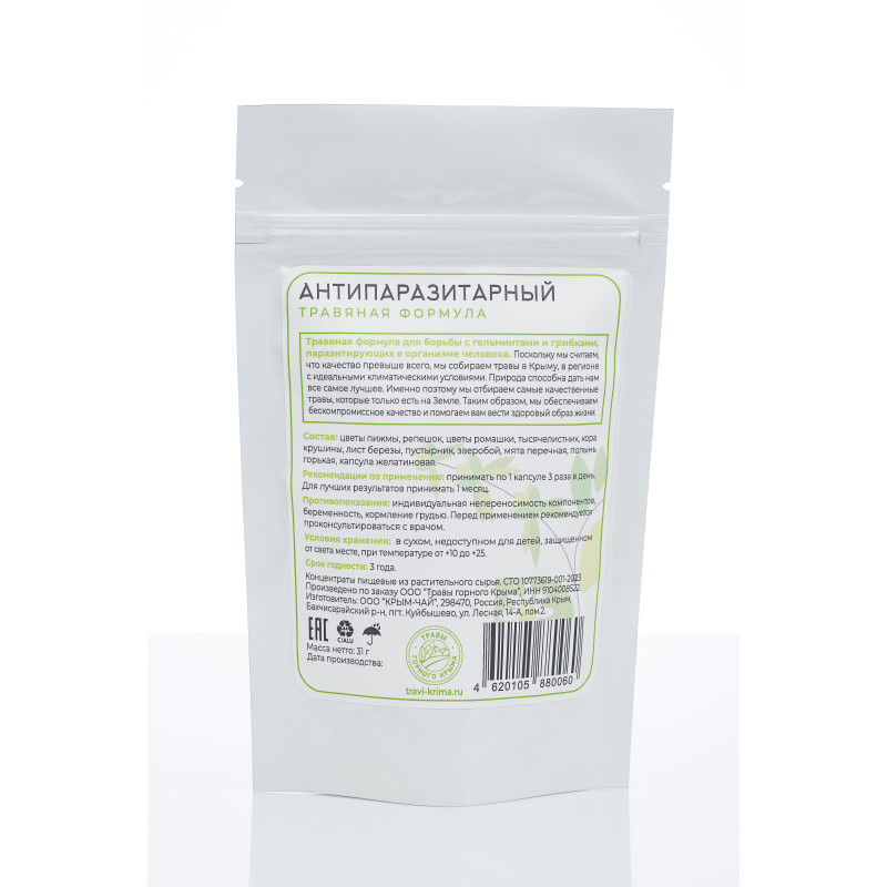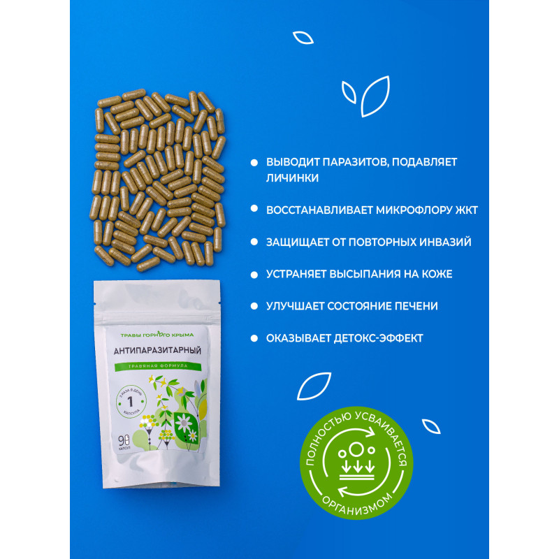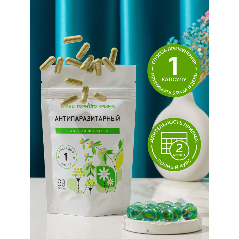 Антипаразитарный сбор трав в капсулах – это готовый препарат для очищения организма от глистов и гельминтов. Он выводит паразитов и останавливает рост личинок. БАД содержит в себе сушеные листья и цветы крымский растений, таких как пижма, мята и зверобой. Они известны своими свойствами очищения и оздоровления организма. Витаминная пищевая добавка также содержит репешок, тысячелистник, пустырник и другие компоненты (полный состав на фото). Комплексная формула обладает накопительным эффектом, курс приема рассчитан на 1 месяц. В отличие от быстродействующих лекарств, травяные таблетки с экстрактом действуют мягко, не вызывая дискомфорта и побочных действий. Подходят вегетарианцам и приверженцам правильного питания. Природное средство оказывает детокс-эффект, способствует уменьшению высыпаний на коже, нормализует работу печени. При наличии домашних животных курс приема противопаразитарных средств следует проводить регулярно. Подходит взрослым мужчинам и женщинам. Рекомендуем хранить в сухом темном месте с товарами бакалеи и продуктами питания.