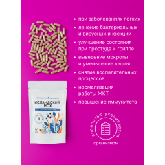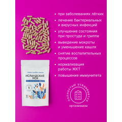 Исландский мох (цетрария исландская) - это природное мощное средство, обладающее сильнейшими противомикробными свойствами. Повышает и укрепляет естественные защитные функции организма, защищает от вирусных и простудных заболеваниях, укрепляет иммунитет. Прекрасно разжижает и выводит мокроту из легких, облегчает дыхание, избавляет от кашля. Природное средство эффективно для лечения болезней легких и бронхов, постковидных симптомов. Натуральный препарат применяется при простуде, гриппе, коклюше, пневмонии, туберкулезе. Также экстракт исландского моха полезен при заболеваниях ЖКТ, аллергии, нарушениях обмена веществ. Природная формула обладает накопительным эффектом, курс приема рассчитан на 2 месяца. В отличие от быстродействующих лекарств, травяные таблетки действуют мягко, не вызывая дискомфорта и побочных действий. Подходят вегетарианцам и приверженцам правильного питания, подходит взрослым и детям.