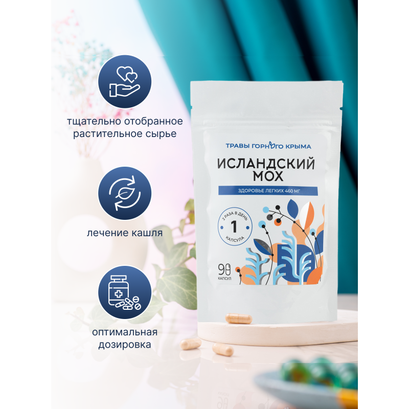 Исландский мох это природное мощное средство, обладающее сильнейшими противомикробными свойствами. Повышает и укрепляет естественные защитные функции организма, защищает от вирусных и простудных заболеваниях. Прекрасно разжижает и выводит мокроту из легких, облегчает дыхание, избавляет от кашля.