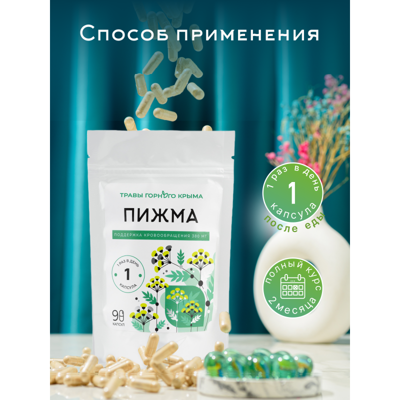 Пижма натуральное средство, известное своими полезными свойствами для поддержания и улучшения здоровья. Имеет желчегонное, антипаразитарное, очищающее, противовоспалительное действие. Она помогает поддержать здоровье сердца, кровеносной системы. Пищевая добавка в капсулах стимулирует кровообращение. Природный экстракт помогает повысить уровень энергии, снять усталость и улучшить жизненный тонус. Стимулирует нервную систему и способствует бодрости. Сушеная пижма в порошке в удобной для приема форме благотворно влияет на состояние кожи и глаз. Улучшает работу желудка и кишечника, это природный спазмалитик, который снимает боли и спазмы. Пижма известна своими противопаразитарными свойствами, способствует очищению организма от паразитов, глистов, аскарид. Употребление травяной формулы поможет поддерживать здоровое состояние организма. Регулярный прием растительной пищевой добавки оказывает детокс эффект, уменьшает отеки. Может применяться взрослыми мужчинами и женщинами. Препарат стимулирует общее оздоровление. Природная формула обладает накопительным эффектом, курс приема рассчитан на 2 месяца. В отличие от быстродействующих лекарств, травяные таблетки действуют мягко, не вызывая дискомфорта и побочных действий.