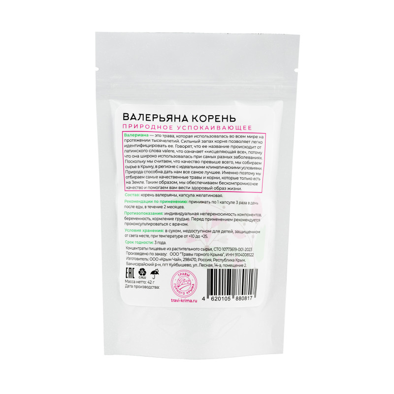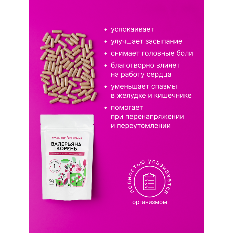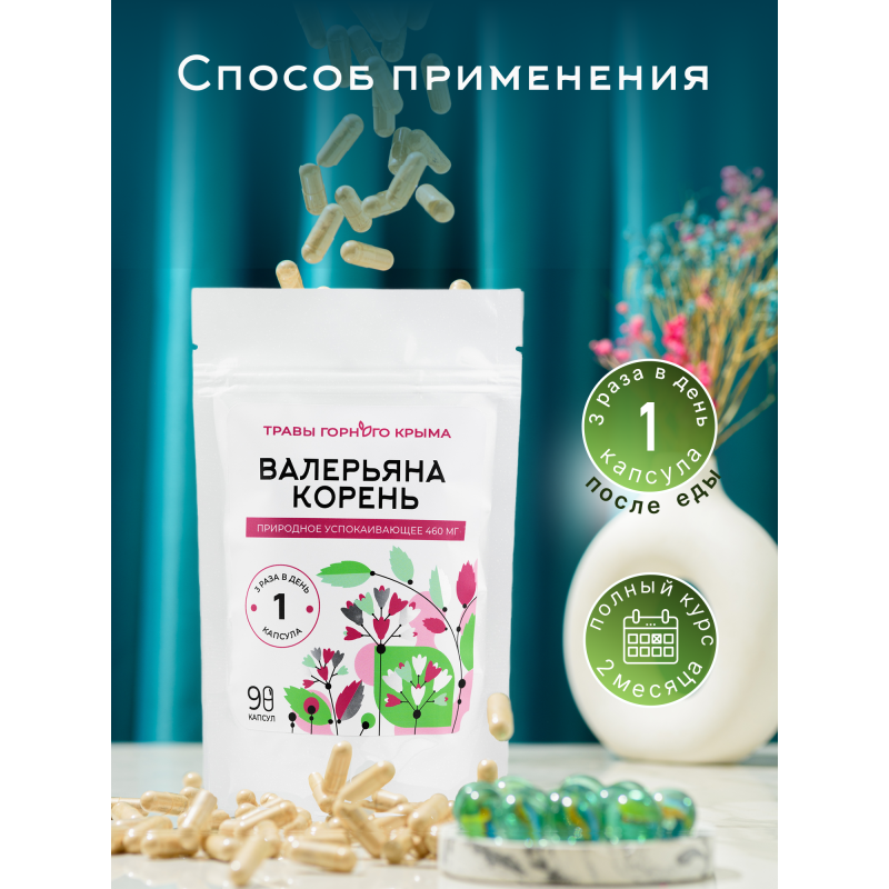 Корень валерианы - это лекарственное растение, известное своими успокаивающими свойствами. Произрастает в крымских регионах и отличается высоким качеством и богатым составом. Удобная для применения форма в капсулах оказывает успокаивающий и расслабляющий эффект. Корень валерианы - часто используется как травяной сбор, улушающий сон. Валерьяна экстракт в капсулах используется в традиционной медицине для снятия нервного напряжения и лечения бессонницы. Природное средство обладает мягким и безопасным воздействием на организм. Регулярный прием убирает трудности с засыпанием, обеспечивает спокойствие, гармонию и релакс. Препараты валерианы применяют как успокоительное средство при продолжительных и систематических нарушениях сна, неврозах сердца и сосудистой системы, при учащенном сердцебиении. Используется валериана в системном лечении таких недугов, как астма, эпилепсия, мигрень, нервное истощение, климактерические приливы, болезни щитовидной железы. Растение валериана воздействует на организм успокаивающе, противоспазматически, противоэпилептически и дает легкий слабительный эффект. При умственных нагрузках валериана стимулирует функции коры головного мозга, устраняет нарушения в ней. Валерьяна лекарственная алтайская 90 капсул в таблетках корень валерьянка - антистресс, успокоение нервов, нормализация сна 90х460мг. Валерьянка для человека для людей обладает накопительным эффектом, курс приема рассчитан на 2 месяца. В отличие от быстродействующих лекарств, травяные таблетки действуют мягко, не вызывая дискомфорта и побочных действий.
