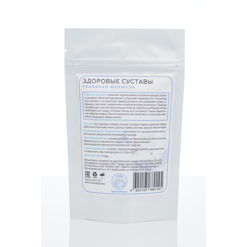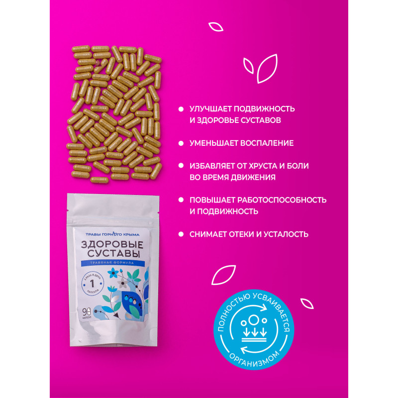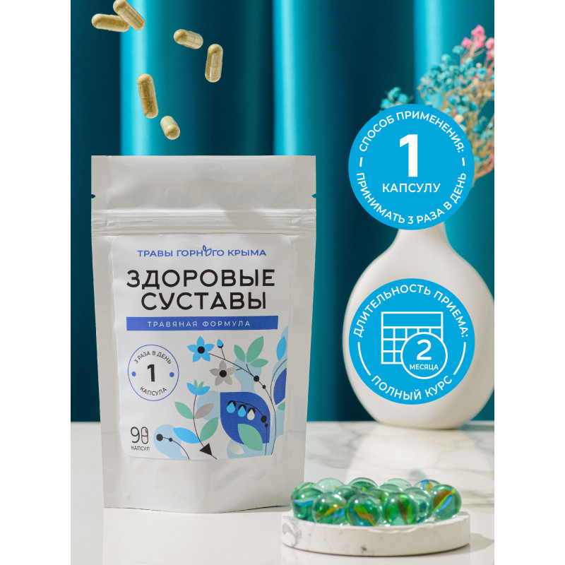 Поддержите здоровье своих суставов и связок с травяной формулой "Здоровые суставы". Эта добавка предназначена как для женщин, так и для мужчин. Каждая капсула содержит уникальный комплекс эко компонентов для поддержания здоровья суставов и связок. Он поможет вам справиться с проблемами, связанными с возрастом, повреждениями или интенсивными физическими нагрузками. Не стоит терпеть боль и ограничения в движении. Попробуйте готовый комплекс экстрактов и наслаждайтесь активной жизнью. Комплекс содержит сушеные листья и корни лекарственных трав и растений. Лопух и сабельник давно известны своими противоревматическими свойствами. Корень солодки обладает противовоспалительным свойством и усиливает действие других ингредиентов. Окoпник дает обезболивающий эффект, способствует скорейшему выздоровлению и укреплению связок и хрящей. Активная формула способствует стимулированию естественной регенерации тканей, препятствию развития деструктивных процессов и старения, обеспечению натуральными структурными элементами для активного обновления и гибкости суставов. Действие и эффективность обусловлена высокой биологической активностью натуральных компонентов, которые способствуют повышению влагоёмкости хряща, предотвращению его высыхания, обеспечивая высокие механические и эластические свойства суставных поверхностей. Этот универсальный продукт поможет вам справиться с проблемами суставов и боли. Помогает в лечении артроза и реабилитации после травм. Органический состав действует на мышцы, улучшая кровообращение и снимая отеки. Идеальный профессиональный выбор для регенерации на спине или коленях. Пищевая добавка регенерирует поврежденные ткани, увеличивает подвижность, защищают от рецидивов. Добавляйте препарат к своему спортивному питанию. При регулярном применении ткани суставов будут восстанавливаться быстрее, сохранится их эластичность, будет быстрее проходить дискомфорт и воспаления. Комплексная формула обладает накопительным эффектом, курс приема рассчитан на 3 месяца. В отличие от быстродействующих лекарств, травяные таблетки действуют мягко, не вызывая дискомфорта и побочных действий.