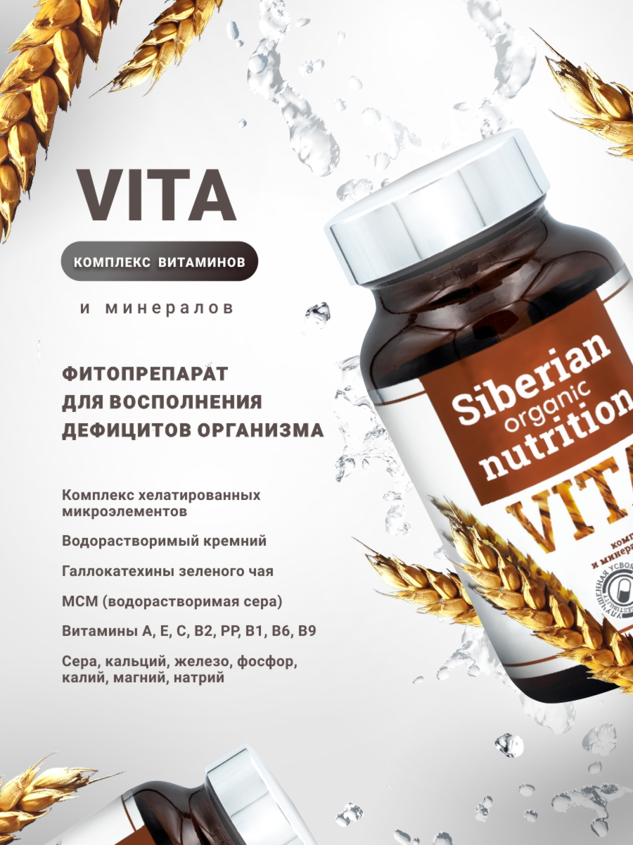 Состав этого комплекса включает хелатированные микроэлементы, водорастворимый кремний, галлокатехины зеленого чая и МСМ . Благодаря этому, Vita помогает укрепить иммунитет, улучшить состояние волос, кожи и ногтей, а также ускорить процесс регенерации тканей после травм.