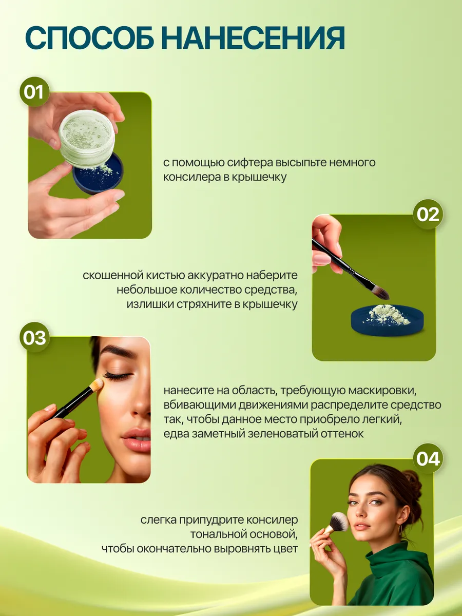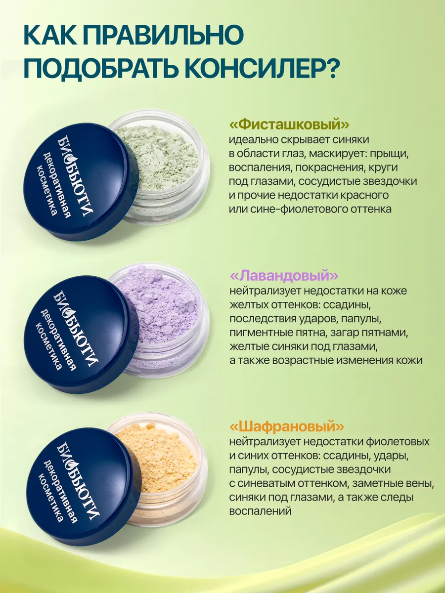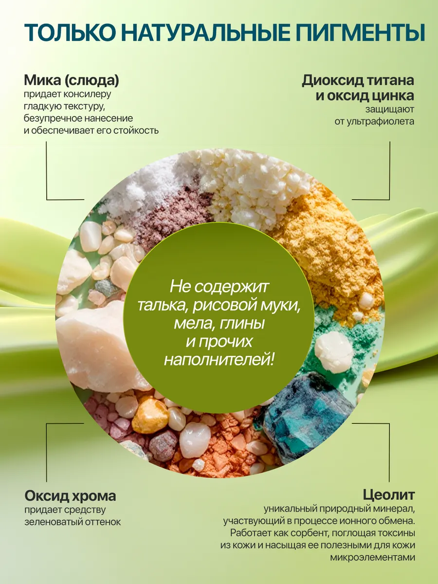 Консилер является незаменимым средством маскировки воспалений и покраснений на лице. Он наносится точечным способом под слой пудры или тональные средства. Идеальным будет выбор средства, в состав которого входят лишь натуральные компоненты, не оказывающие вредного воздействия на вашу кожу. Консилер «Фисташковый» состоит на 100% из натуральных минеральных веществ. Он идеально скрывает синяки в области глаз, покраснения на коже, сосудистые звездочки, прыщи и прочие недостатки красного или сине-фиолетового оттенка. Средство с натуральным составом не содержит вредных неорганических веществ. Консилер идеально скрывает недостатки кожи благодаря своей плотности и фисташковому цвету. Он не забивает поры, и лицо остаётся максимально естественным, его можно применять ежедневно перед нанесением макияжа. Эффект использования: Консилер является важным этапом создания макияжа и наносится непосредственно на проблемные участки кожи. Он помогает скрыть изъяны кожи, сделать тон ровным, ускорить исчезновение следов воспаления. Консилер уменьшает круги под глазами, делая их практически незаметными. Кожа становится свежей и чистой. Действие: маскирует недостатки различных оттенков (прыщи, воспаления, круги под глазами); не заметен на коже; помогает коже справиться с микроповреждениями; выравнивает тон кожи