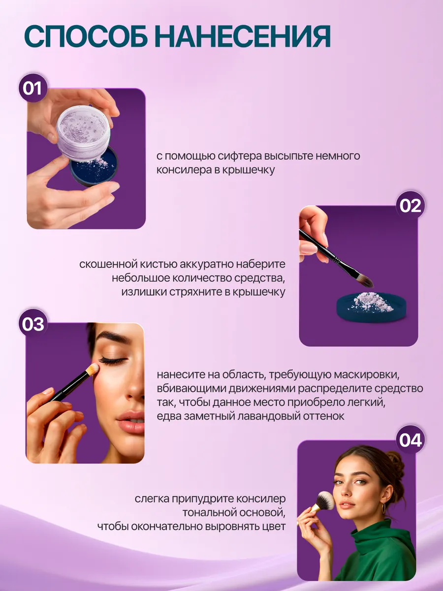 Консилер является ещё одним этапом в формировании макияжа. Он используется для точечного нанесения на проблемную зону под или на слой пудры. Он делает менее заметными такие недостатки кожи, как пигментные пятна, желтые синяки и желтоватый цвет лица. Идеально скрывает темные круги под глазами и маскирует коричневатые пятна. Консилер состоит только из минералов. В состав входит цеолит — минерал, питающий кожу лица ионами меди и серебра и способствующий её омоложению. Мика — ещё один минерал в составе консилера, который корректирует и выравнивает тон, маскирует пятна на коже. В состав также входят защищающие от солнечных лучей диоксид титана и оксид цинка. А ультрамарин прекрасно справляется с коррекцией пигментных пятен. Действие: нейтрaлизyет нeдoстaтки на кoже жeлтых oттeнков (сcадины, пoследcтвия yдaров, папулы, пигментные пятна, загар пятнами, а также возрастные изменения кожи); хорошо ложится на кожу, совсем не заметен; корректирует и выравнивает тон; обладает омолаживающим эффектом