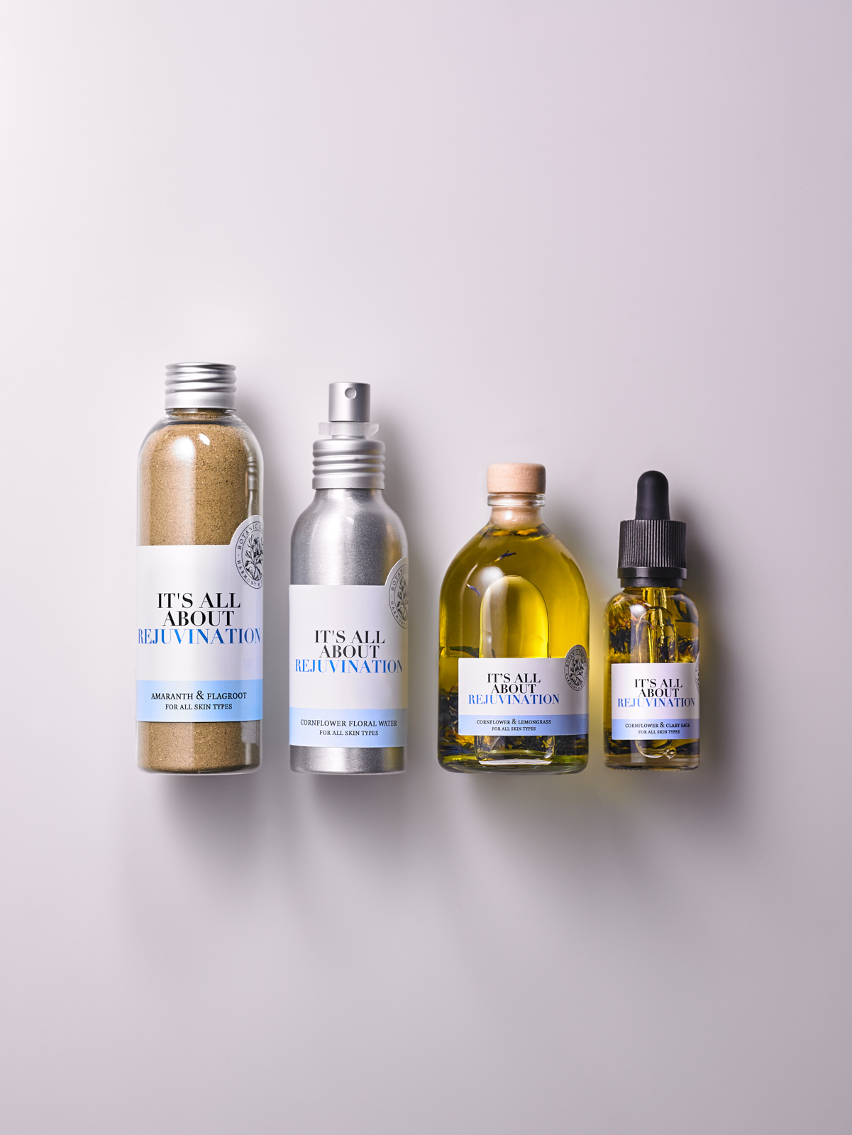 Состав: Омолаживающая маска для лица «Амарант & Корень аира» 100 мл, Цветочная вода «Василек» 100 мл, Масло для тела «Василек & Лемонграсс» 100 мл, Омолаживающее масло для лица «Василек & Шалфей Мускатный» 30 мл.