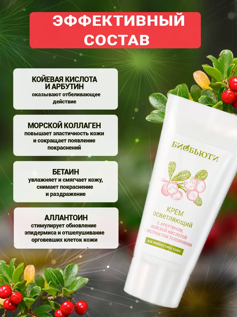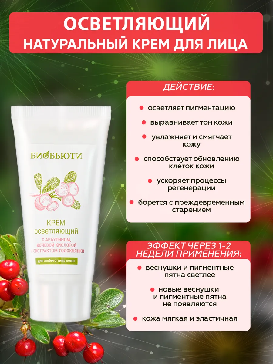 Органический крем для лица «Осветляющий» от бренда натуральной косметики Биобьюти не только осветляет, но и глубоко увлажняет кожу и ускоряет процесс регенерации. Этот профессиональный уходовый крем подходит для любого типа кожи как дневной и ночной и станет надежным помощником тем, кто страдает от пигментации, веснушек или проблемных участков на лице и его кожа нуждается в осветлении иОт пигментных пятен.увлажнении.
