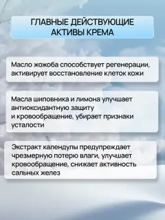 Натуральные компоненты в составе способствуют омоложению кожи, насыщению ее витаминами. Масло жожоба способствует регенерации, активирует восстановление клеток кожи. Крем подарит коже антиоксидантную защиту, кровообращение улучшится и признаки усталости исчезнут.