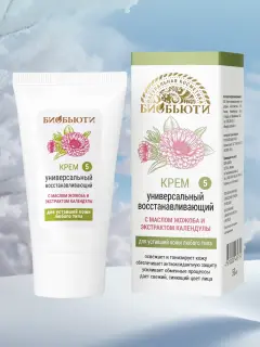Крем от производителя натуральной косметики БиоБьюти «Универсальный восстанавливающий» для лица, шеи и декольте устранит вялость и усталость кожи, наполнит ее здоровьем и красотой.Можно наносить как дневной и ночной. Универсальный - подходит для мужчин. При ежедневном использовании возвращает коже упругость, тонизирует и питает ее, обладает разглаживающим действием, (возможно использовать как крем от морщин). Он подходит для кожи любого типа: питает и насыщает сухую кожу, нормализует работу сальных желез кожи с повышенной жирностью. Крем выравнивает цвет лица, устраняет воспаления, улучшает кровообращение. Подходит для ежедневного ухода, может использоваться перед нанесением макияжа - он быстро впитывается и создает защитный слой для кожи.
