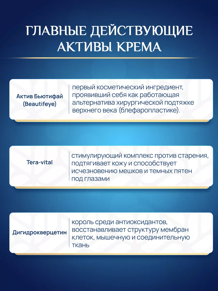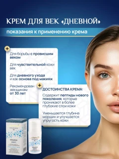 Подтягивает провисшее верхнее веко, разглаживает морщинки в уголках глаз, устраняет отечность и тёмные круги - синяки под глазами, повышает целостность кожных капилляров.