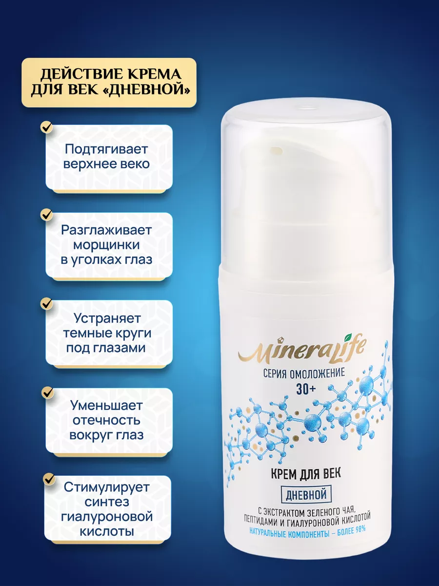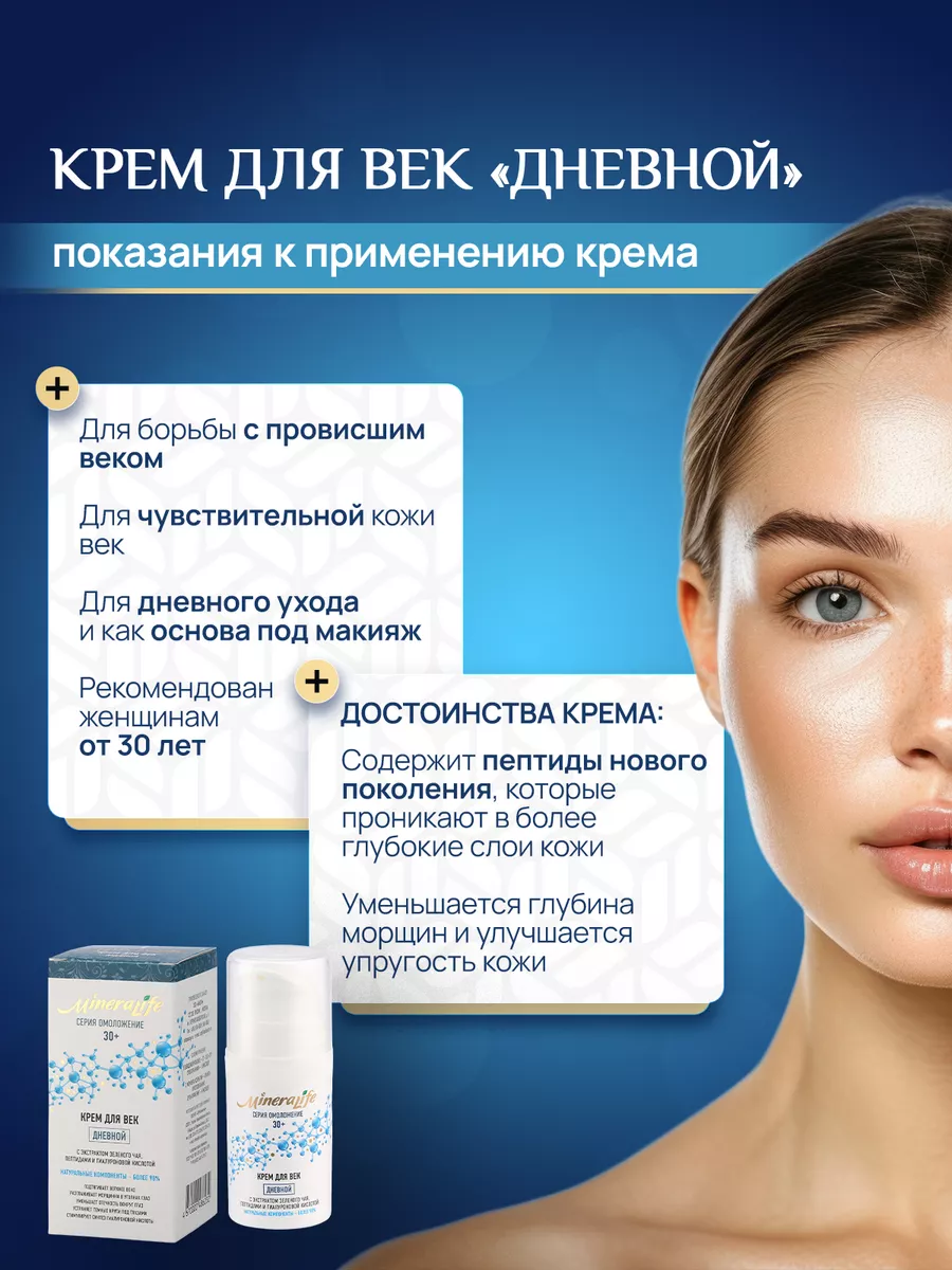 Крем для век “Дневной” Минералайф с экстрактом зеленого чая, пептидами и гиалуроновой кислотой имеет легкую и нежную структуру, быстро впитывается.