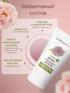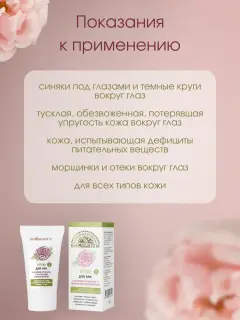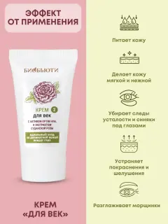 Крем российского производителя натуральной косметики БиоБьюти «Для век» с экстрактом суданской розы предназначен для сухой и чувствительной кожи вокруг глаз на каждый день. Этот органический крем обладает мягкой и нежной текстурой. В его состав входят натуральные компоненты, увлажняющие и питающие кожу век а также защищающие ее. При регулярном применении улучшает внешний вид кожи вокруг глаз. Кожа укрепляется, наполняется витаминами, уходят «мешки» под глазами, скрадываются мелкие морщины. Входящий в состав крема экстракт лепестков розы укрепляет капилляры и устраняет венозный застой, чем помогает от кругов под глазами. Благодаря его лечебному действию темные круги постепенно исчезают, пропадают следы усталости. Экстракты петрушки и клевера, различные питательные масла смягчают кожу и устраняют покраснения, сухость и шелушения. Средство подходит для любого типа кожи, в том числе и чувствительной, и хорошо сочетается с кремами и масками для лица БиоБьюти. Крем «Для век» имеет антивозрастной эффект, замедляет старение кожи и способствует активной регенерации клеток. Может использоваться кaк днeвнoй и нoчнoй крeм. Он хорошо питает и насыщает тонкую кожу у глаз, от него не остается жирного блеска и он является хорошей базой под макияж. Кожа обретает естественный цвет. Крем выпускается в тюбике. После вскрытия хранить в холодильнике. Не тестируется на животных. Вы можете найти всю линейку уходовой косметики наших брендов в нашем магазине на WB: просто наберите БИОБЬЮТИ в поиске
