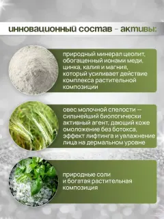 Маска для лица серии Биобьюти Элит «Омоложение. Экспресс-регенерация» - это инновационный уровень ухода за кожей лица и шеи, который обеспечивает оперативную подтяжку кожи и разглаживание морщин. 100% натуральный продукт. Рекомендуется применять после 26 лет. Сухая форма косметического средства полностью сохраняет все полезные свойства минералов и растений, содержащихся в маске. Основные активные компоненты маски: мoдифицирoвaнный прирoдный цeoлит, обoгaщeнный ионами меди, цинка, калия и магния, который усиливает действие комплекса растительной композиции. А овес молочной спелости - сильнейший биологически активный агент, дающий коже омоложение без ботокса – эффект лифтинга и увлажнение лица на дермальном уровне. Регулярное использование маски заметно омолаживает лицо. Это происходит за счет стимуляции синтеза коллагена и эластина и ускорения обновления эпидермиса. При комплексном использовании маски с предварительным очищением Биочисткой или скрабом Fresh Facе процедура сопоставима с радикальными косметическими процедурами: пластикой и химическим пилингом! Хранить при комнатной температуре в закрытой банке. Не допускать попадание влаги внутрь. Не тестируется на животных. Можно использовать во время беременности и кормлении грудью. Срок годности – 2 года. Эффект от использования маски: помогает коже бороться с возрастными изменениями и заметно уменьшает глубину морщин. Она способствует ускорению обновления эпидермиса. Средство защищает, тонизирует и выравнивает кожу. Для получения заметного и стойкого эффекта обновления и омоложения кожи рекомендуется проводить ежедневные процедуры по 10-15 минут в течение 30 дней, второй месяц – через день, третий месяц – через два дня. Для поддержания достигнутого эффекта по истечении этого срока рекомендуется проводить процедуры не реже двух раз в неделю. Эффект после одной процедуры сохраняется 2-3 дня, а после окончания полного курса поддерживается не менее полугода.