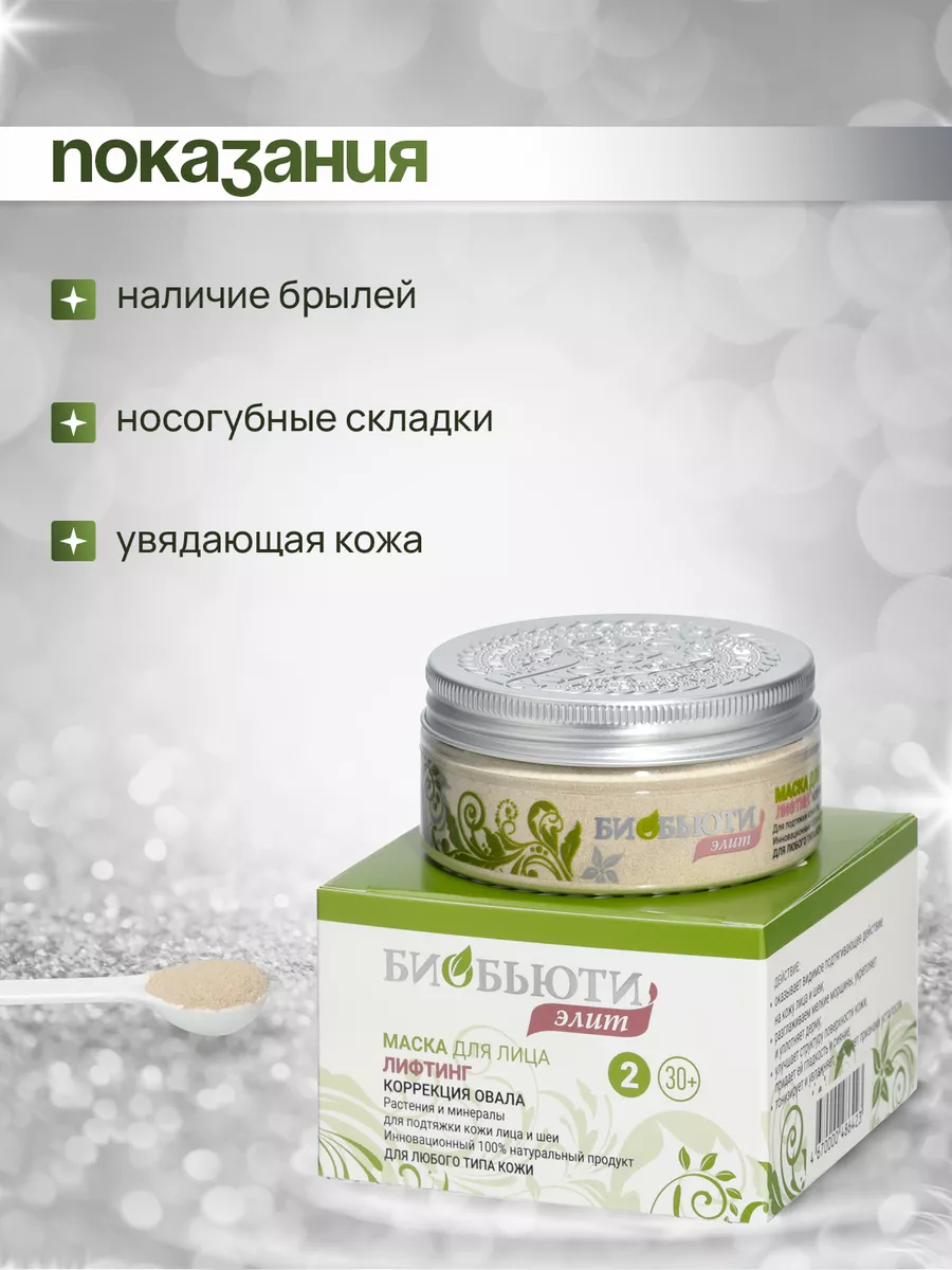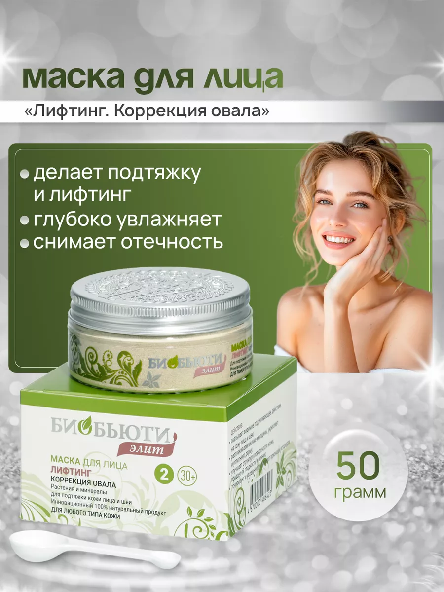 Маска для лица серии Биобьюти Элит «Лифтинг. Коррекция овала» - это инновационный уровень ухода за кожей лица, шеи и зоны декольте, который обеспечивает оперативную подтяжку и лифтинг. 100% натуральный продукт. Сухая маска с первых применений оказывает видимое подтягивающее действие на лицо, шею и зону декольте. Содержит мoдифицирoвaнный прирoдный цeoлит, обогащенный ионами меди, цинка, калия и магния, овес молочной спелости - сильнейший биологически активный агент, дающий коже омоложение без ботокса, эффект лифтинга и увлажнение лица на дермальном уровне. Овес молочной спелости замедляет апоптоз – естественный процесс гибели клеток. Благодаря этому компоненту продлевается жизнь клеток, активируются процесс их обновления. Цеолит сохраняет все полезные свойства компонентов, входящих в состав маски, он активирует их действие и способствует проникновению глубоко в кожу. Эта маска - отличный выбор для ухода за кожей лица после 30 лет. Она снимает отечность, оказывает лимфодренажный эффект, питает и насыщает кожу. При комплексном использовании маски с предварительным очищением Биочисткой или скрабом Fresh Facе процедура сопоставима с радикальными косметическими процедурами: пластикой и химическим пилингом! Хранить при комнатной температуре в закрытой банке. Не допускать попадание влаги внутрь. Не тестируется на животных. Можно использовать во время беременности и кормлении грудью. Для получения заметного и стойкого эффекта обновления и омоложения кожи рекомендуется проводить ежедневные процедуры по 10-15 минут в течение 30 дней, второй месяц – через день, третий месяц – через два дня. Для поддержания достигнутого эффекта по истечении этого срока рекомендуется проводить процедуры не реже двух раз в неделю. Эффект после одной процедуры сохраняется 2-3 дня, а после окончания полного курса поддерживается не менее полугода.