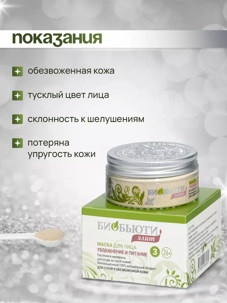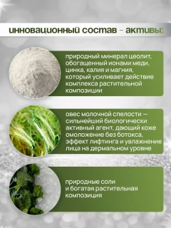 Интенсивный уход за сухой и чувствительной кожей. Маска «Увлажнение и питание» предназначена для глубокой гидратации кожи и устранения проблем стянутости и шелушения. Но также маска хорошо восстанавивает упругость и эластичность, омолаживает и разглаживает морщины. Это 100% натуральный продукт. Рекомендуется применять после 26 лет. Уникальный состав маски способствует насыщению клеток кожи всеми необходимыми витаминами, улучшает кровообращение и нормализует функционирование сальных желез. Основные активные компоненты маски: мoдифицирoвaнный прирoдный цeoлит, обогащенный ионами меди, цинка, калия и магния, который усиливает действие комплекса растительной композиции. А овес молочной спелости – сильнейший биологически активный агент. Он дает коже омоложение без ботокса, эффект лифтинга и увлажнение лица на дермальном уровне. Овес молочной спелости замедляет апоптоз – естественный процесс гибели клеток. Благодаря этому компоненту продлевается жизнь клеток и активируется процесс их обновления. При комплексном использовании маски с предварительным очищением Биочисткой или скрабом Fresh Facе процедура сопоставима с радикальными косметическими процедурами: пластикой и химическим пилингом! Хранить при комнатной температуре в закрытой банке. Не допускать попадание влаги внутрь. Можно использовать во время беременности и кормлении грудью. Эффект от использования маски: поддерживает баланс воды и липидов в эпидермисе, что улучшает барьерную функцию кожи. Маска улучшает цвет лица и заметно уменьшает признаки усталости кожи. Для получения заметного и стойкого эффекта увлажнения и омоложения кожи рекомендуется проводить ежедневные процедуры по 10-15 минут в течение 30 дней, второй месяц – через день, третий месяц – через два дня. Для поддержания достигнутого эффекта по истечении этого срока рекомендуется проводить процедуры не реже двух раз в неделю. Эффект после одной процедуры сохраняется 2-3 дня, а после окончания полного курса поддерживается не менее полугода.