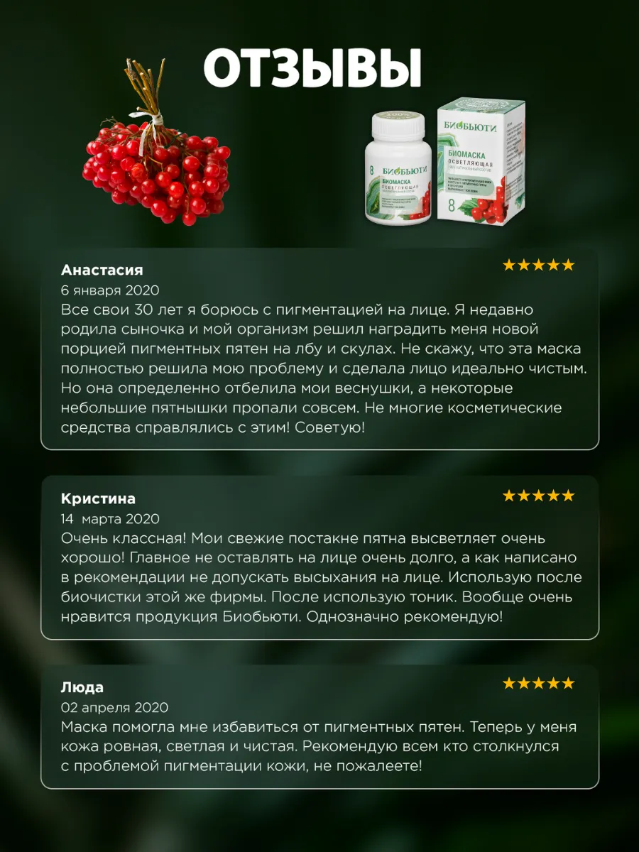 Маска для лица БиоБьюти №8 «Осветляющая» способствует снижению синтеза пигмента и осветлению пятен и веснушек. Приятным бонусом является эффект омоложения и обновления кожи. При регулярном применении маски восстанавливается липидный барьер и синтезируется молодой коллаген. Средство отлично подходит для сухой кожи, т.к. за счет полноценного насыщения кожи витаминами фитогормонами и микроэлементами нормализуются водно-солевой баланс и капиллярный кровоток. Маска «Осветляющая» изготовлена только из природных материалов, обработанных с применением высоких технологий. Ее легко применять в домашних условиях. Натуральный состав содержит минералы соли злаки и полезные растения. Все это в сухом измельченном виде. Используя эту маску, Вы получите здоровый цвет лица и лучшую структуру ее поверхности. Ваша кожа лучше наполнится влагой и придет в тонус, а мелкие морщинки будут менее заметны. Применение средства отбеливает и освежает кожу и устраняет неэстетичный жирный блеск — это заинтересует обладательниц жирной кожи. Витамины А Е К и группы В, содержащиеся в маске, обеспечивают эластичность кожи, сохраняют естественную влагу и препятствуют агрессивному влиянию окружающей среды. Кроме этого, маска лечит различные воспаления кожных покровов и удаляет омертвевшие клетки кожи. Она просто создана для хорошего питания дермы, а еще обладает болеутоляющим и бактерицидным свойством — что помогает при лечении угревой сыпи. Хотите, чтобы Ваше лицо стало свежим и сияющим? Делайте маску регулярно два - три раза в неделю. Только так можно будет судить о результате. Срок годности — 2 года. Хранить в сухом месте. Наносить только на очищенное лицо, для этого советуем применять Биочистку. После такого глубокого очищения поступление природных витаминов, антиоксидантов и других питательных веществ в глубокие слои кожи значительно облегчается и ускоряется ***Перед первым применением проверить реакцию на сгибе локтя.