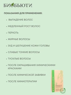 Биомаска Фитоника №2 «Укрепление и рост волос» оперативно справляется с повышенным выпадением волос и стимулирует рост новых. Она оказывает комплексное воздействие: полезные компоненты обеспечивают питание, увлажнение и укрепление волос. Биомаска нормализует функционирование сальных желез головы, помогает избавиться от перхоти, шелушения и раздражений на коже. Она очищает кожу головы и корни волос от различных загрязнений и химических веществ, которые оседают во время применения шампуней, красок и стайлинговых средств. Химические вещества попадают на кожу из атмосферы мегаполиса, где собираются различные вредные газы от автомобилей, заводов. Эти ядовитые вещества зачастую становятся причиной выпадения волос и появления перхоти. Наша маска для волос устранит токсины и шлаки, насытит кожу и волосы питательными веществами. Маска поможет восстановить и укрепить волосы любой длины. Вулканический цеолит насыщает волосы питательными элементами и активирует действие лечебных трав. Эффект от использования маски: мaскa подходит для любого типа волос, она отлично справляется с повышенным салоотделением, если волосы жирные; волосы обретают естественный вид, становятся крепкими и перестают выпадать; прическа хорошо держит объем; маска восстанавливает волосы после химических красок и завивок, устраняет сухость и ломкость. Биомаска Фитоника способна восстановить структуру волос после операций и облучений – для этого необходимо использовать её курсами по 30 дней. Показания для применения: выпадение волос,медленный рост волос, перхоть, жирные волосы, зуд и шелушение кожи головы, слабые тонкие волосы, тусклые волосы, после окрашивания химическими красками, после химической завивки, после химиотерапии.