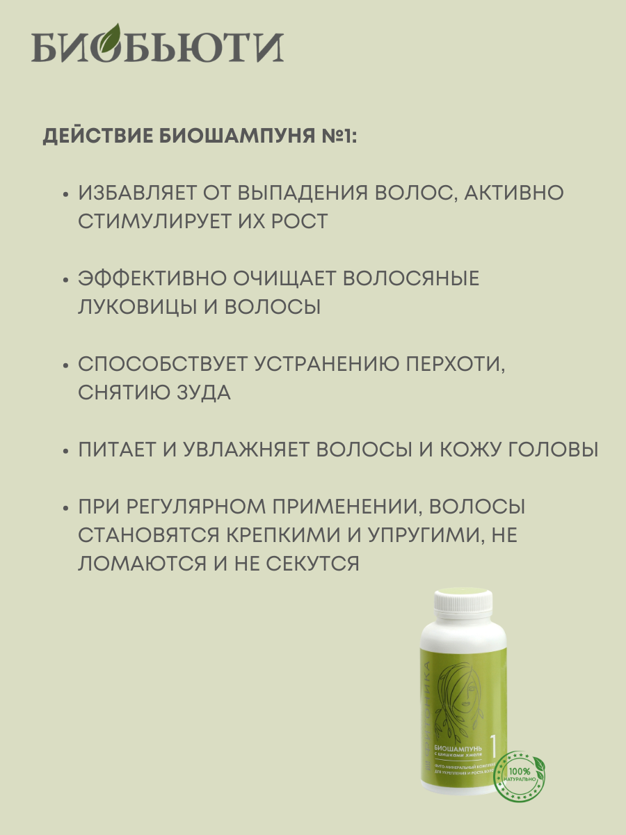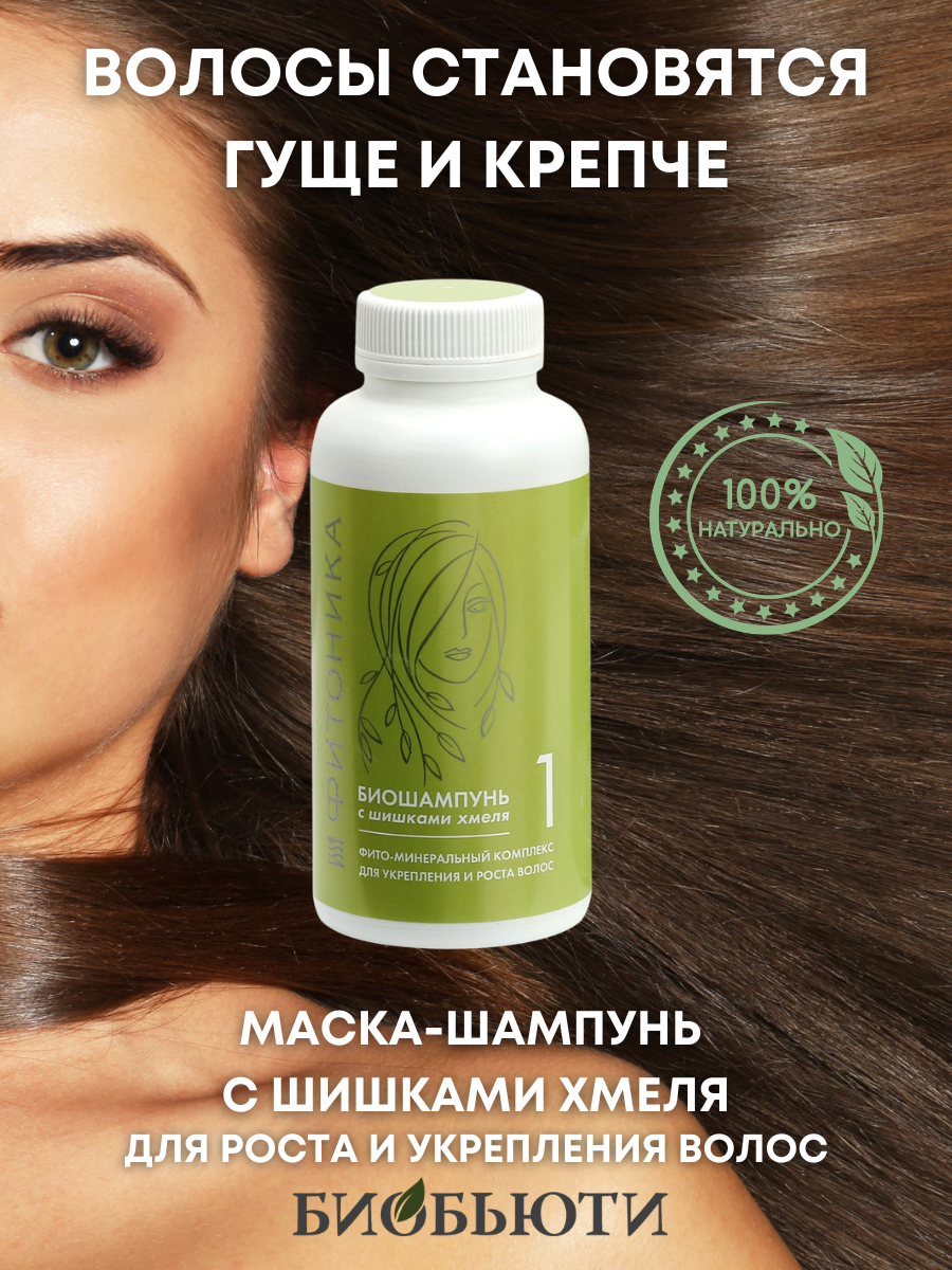 Биошампунь «Фитоника» № 1 «С шишками хмеля» - сухой шампунь, изготовленный из вулканических минералов (цеолитов), солей и полезных растений. Натуральный шампунь осуществляет активное воздействие на клетки кожи за счет наличия минералов в составе данного средства. Он идеально подходит людям с чувствительной, склонной к аллергическим реакциям, кожей, так как не содержит вредных добавок. Средство отлично очищает волосы от частиц пыли и от жира. Еженедельное применение шампуня в сочетании с массажем способствует отшелушиванию мертвых частиц и сорбции загрязнений. Полезные элементы средства попадают в структуру волос, а органические кислоты способствуют улучшению кровообращения кожи. За счет комплексного воздействия шампуня для укрепления волос нормализуется состояние кожи головы, волосы становятся толще, эластичнее, не ломаются и не секутся. Средство также избавляет от перхоти, раздражений, также избавляет от выпадения волос, оно активно стимулирует их рост. Маска-шампунь эффективно очищает волосяные луковицы и волосы, способствует устранению перхоти, снятию зуда. Снимает раздражение кожи, не вызывает аллергии. После некольких применений волосы становятся крепкими и упругими, они не ломаются и не секутся, выглядят здоровыми и красивыми.
