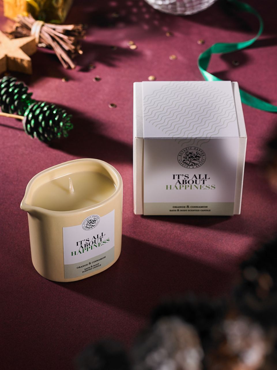 Наши свечи сочетают функции ароматерапии и ухода. Аромат эфирных масел апельсина и специй бодрит, вызывает чувство искрящейся радости, оптимизма, открытости миру. Растаявшее масло жожоба, кокоса, миндаля и натуральный косметический соевый воск отлично питают кожу, устраняют сухость, размягчают наиболее грубые и шершавые участки эпидермиса.