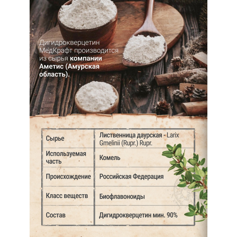 Дигидрокверцетин сибирский, произведен из российской лиственницы, и является одной из форм кверцетина, (природные биофлавоноиды), который ценится за свои антиоксидантные и противовоспалительные свойства.
