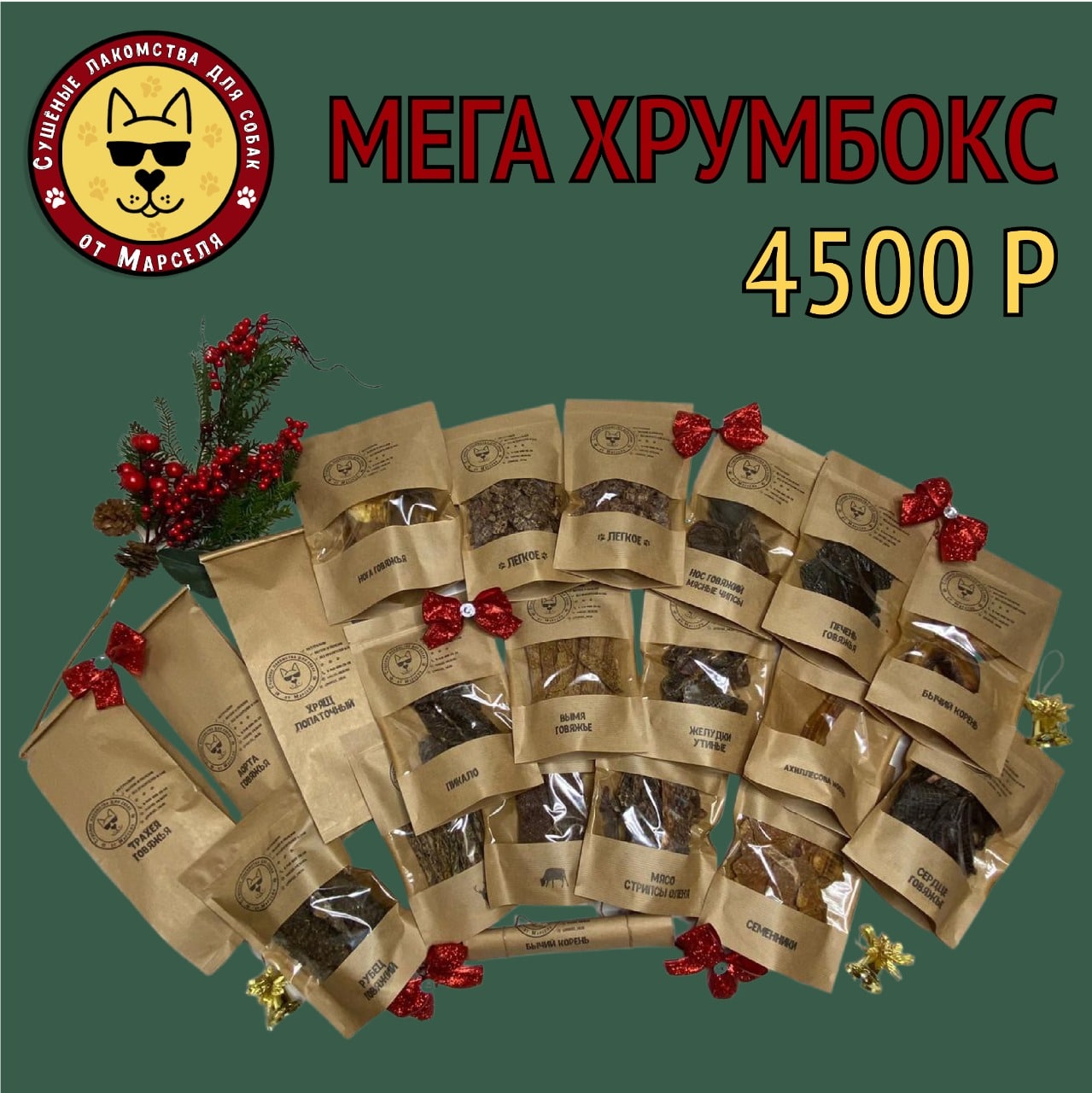 С НОВЫМ МЕГА-ХРУМБОКСОМ Ещё не знаете, что подарить своему хвостику ? Наш новый меганабор станет идеальным подарком! В состав Хрумбокса входят: Вымя говяжье 100г Аорта говяжья 2 шт Бычий корень ватрушка 1 шт Уши говяжьи 2шт Лёгкое говяжье брусочки 100гр Колбаски легкое говяжье 100гр Рубец говяжий 100г Сердце говяжье 100г Трахея говяжья длинная 2 шт Пикало Оленя 100гр Чипсы из носа (губы) 1 уп Лёгкое говяжье 2/2см 100г Желудки утиные 100г Пикало говяжье 100г Колбаски из индейки 100гр На фото и в описании состав может отличаться, всегда смотрите описание Состав просто пушка Каждый из вас может собрать свой ХрумБокс написав нам в чате с радостью соберем для вас персональный ХрумБокс Доставка ТК по всей России. Звони и заказывай!