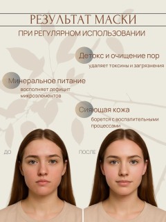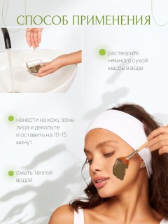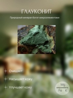 Состав Природный минерал - глауконит Способ применения Растворить немного сухой маски в воде (в соотношении 50:50). Нанести на кожу лица и зоны декольте, оставить на 10-15 минут. Смыть теплой водой.
