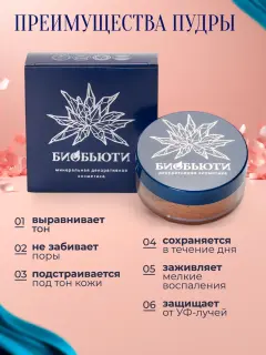 Кроме того, пудра обладает защитными свойствами благодаря SPF-фильтрам, что помогает предотвратить негативное воздействие солнечных лучей. Это особенно актуально для повседневного использования, когда ваша кожа подвергается воздействию ультрафиолетовых лучей. Минеральная основа пудры бережно ухаживает за кожей, обеспечивая ей необходимую защиту и комфорт.