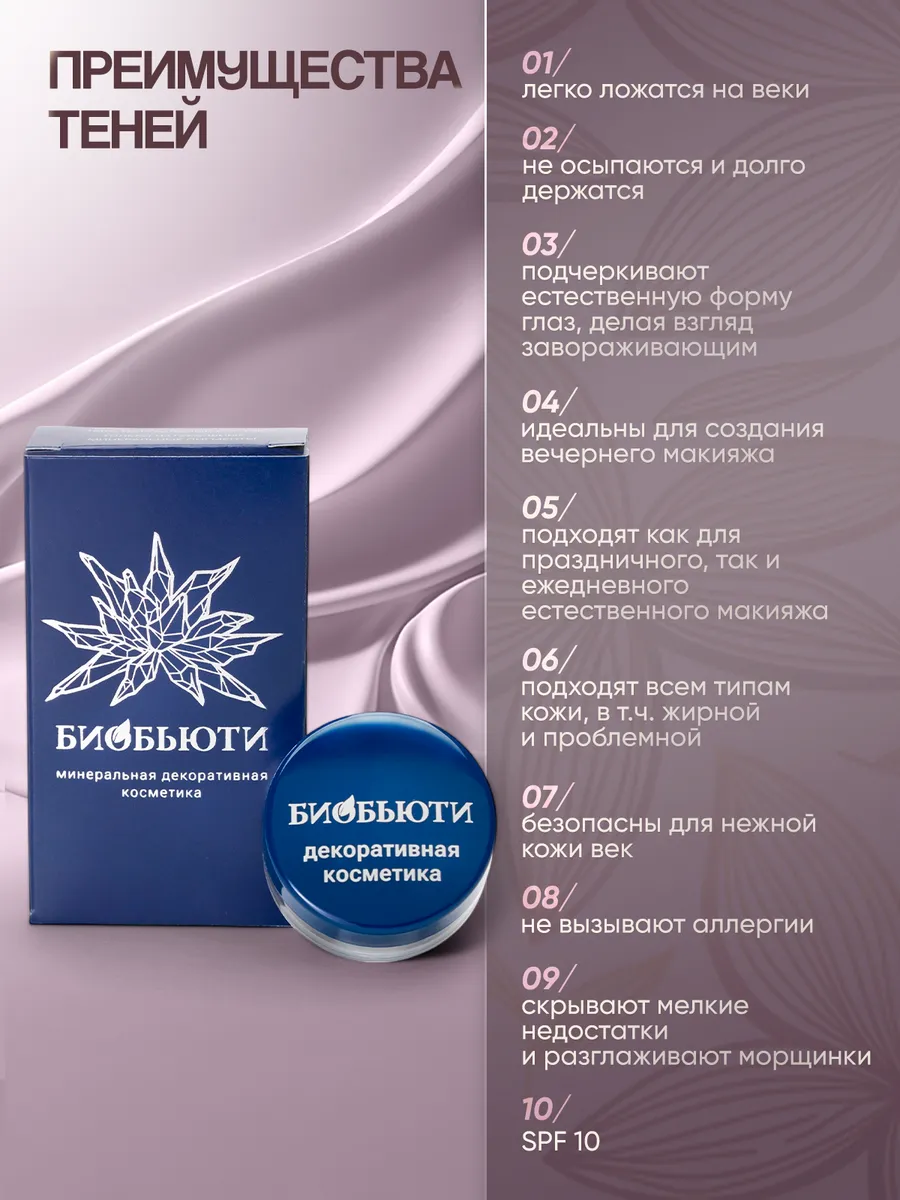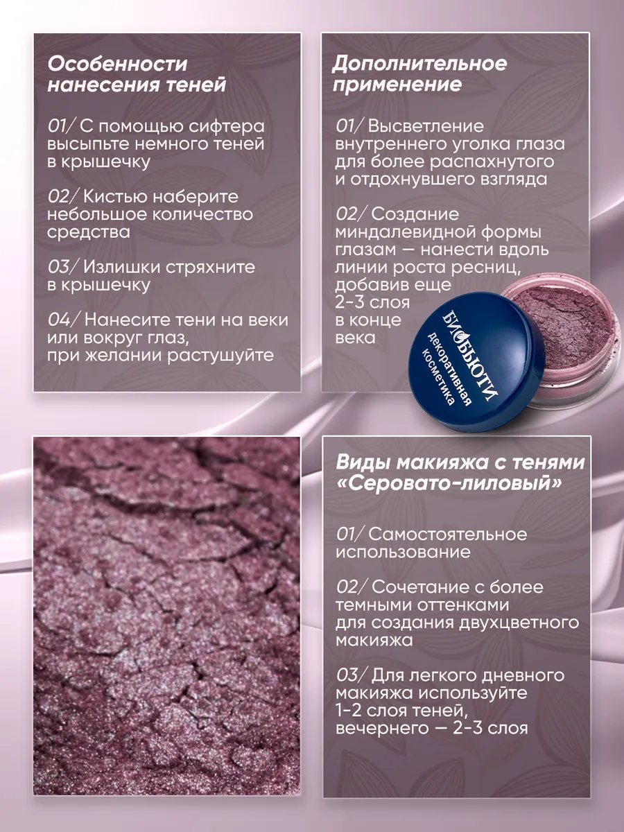 С данным оттенком Ваши глаза всегда будут яркими и выразительными, а весь образ эффектным и стильным. С такими тенями вы будете очаровывать всех шармом своих глаз. Данные тени подойдут для любого образа, делового, офисного, натурального и даже яркого вечернего при сочетании с более контрастными оттенками. Принцип действия: Легкая, невесомая текстура теней «Серовато-лиловый» позволяет придать глазам отдохнувший и свежий вид, создавая легкий образ. Тени имеют универсальный цвет, поэтому их можно использовать в любом макияже при любом цвете глаз.