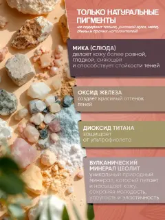 Тени для век «Светло-терракотовый» имеют перламутровую текстуру и красивый оттенок, они отлично подходят для любого цвета глаз. Тени станут ярким акцентом макияжа, они подчеркнут или скорректируют естественную форму глаз. Тени могут использоваться для ежедневного макияжа, с ними можно создать яркий и оригинальный образ. Также тени используются для создания вечернего макияжа, они хорошо сочетаются со многими темными оттенками. Натуральные тени можно использовать каждый день – они не причиняют вред коже, не сушат ее и не вызывают раздражений. Изготовленные из минералов тени сохраняют красоту глаз на долгие годы. Минерал цеолит препятствует старению кожи, разглаживает меткие морщинки, скрывает недостатки кожи. Цеолит питает нежную кожу век, наполняет ее полезными элементами. Он поддерживает молодость кожи, стимулирует обменные процессы в клетках. Красивый оттенок теням придают мика и оксид железа. Тени не вызывают раздражений, не сушат кожу, их можно наносить на кожу век ежедневно. Натуральные тени хорошо ложатся и делают кожу гладкой, как шелк.