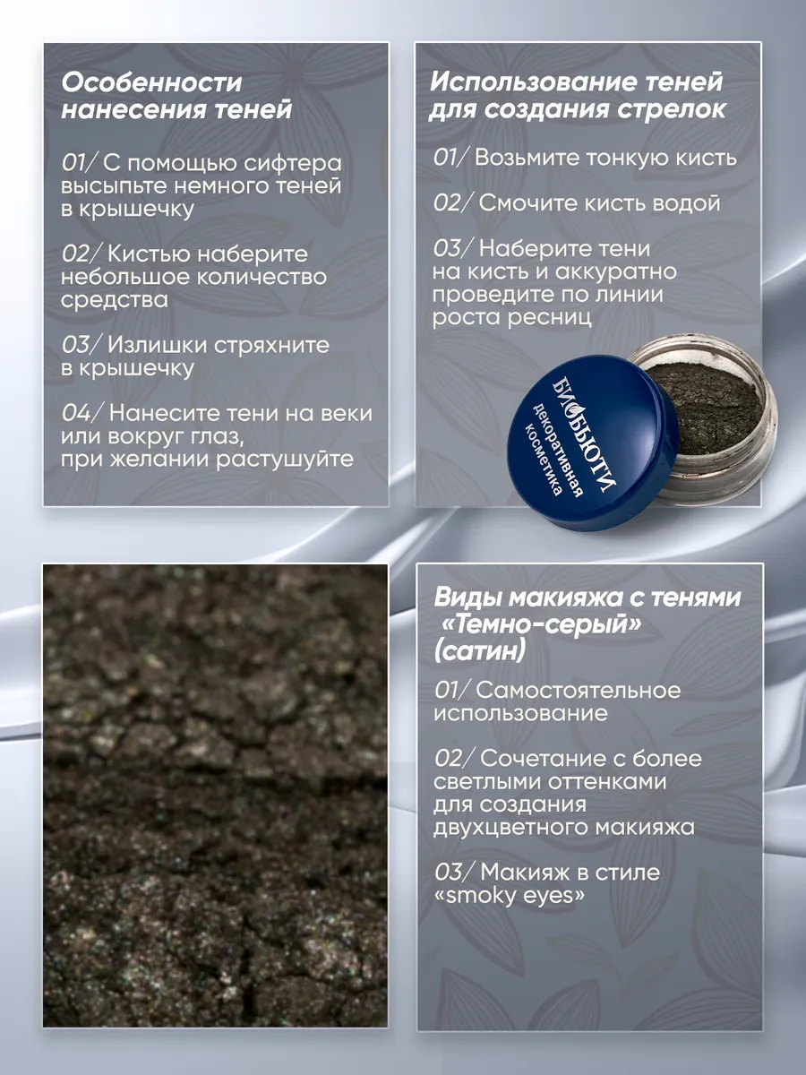 С данными тенями очень удобно моделировать форму глаза, не боясь переборщить. «Темно-серый» идеально подчеркивают красоту глаз, делая взгляд более привлекающим, ярким и неповторимым. Принцип действия: Тени «Темно-серый» с помощью своего необычного цвета поразят вас своей универсальностью, с ними Ваш взгляд будет зачаровывать каждого. Данный оттенок позволяет создать классический и благородный макияж, благодаря своей легкой и нежной текстуре.